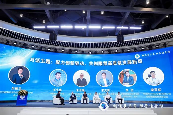 此外,会议设置了嘉宾对话环节,以“聚力创新驱动,共创服贸高质量发展新局”为主题,合肥市服贸易与服务外包行业协会会长吴福全引导嘉宾围绕“创新”和“发展”进行了分享与探讨。