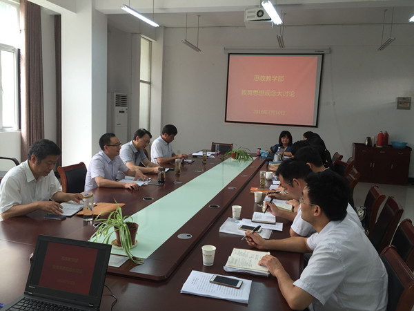 根据学院和思政部“教育思想观念大讨论”活动安排,7月11日下午,思政部开展了第三次教育思想观念大讨论。全体教师围绕“在思想政治理论课教学中,如何加强大学生社会责任教育”、“如何在思政理论课教学中融入创新创业能力教育和职业精神教育”、“面对招生制度改革,如何改革思政理论课教学”等三个问题展开了热烈的讨论,学院党委书记、思政部“四个一”联系点领导章顺来参与讨论并给予指导。
