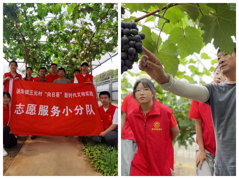 在三元村大圣葡萄种植基地,负责人汪大圣先生告诉同学们,他接触葡萄种植已有30余年,种植基地里的葡萄品种有十余种。大圣葡萄种植基地在获得一定的经济效益后,汪大圣先生并没有独享其成,而是选择将技术传授给其他人,对于一些困难户,更是积极帮助他们免费进行品种改良,赠送部分种苗,进行技术指导。大圣葡萄种植基地给更多人带来了就业机会,提供了就业岗位,带动了周边地区经济发展,为脱贫攻坚任务助力,为乡村振兴事业添砖加瓦。