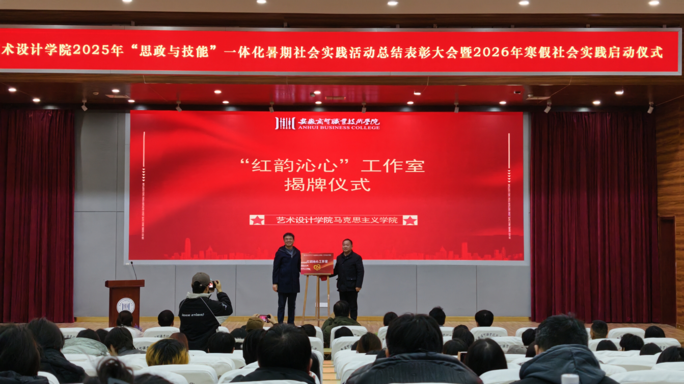 为把党建结对共建工作落到实处,马克思主义学院党总支和艺术设计学院党总支结合新时期思政育人工作需求,携手成立“红韵沁心”工作室,共筑思政育人新路径,推进“大思政”工作体系建设。1月8日晚,在艺术设计学院举办的2025年暑期“思政与技能”社会实践总结表彰暨2026年寒假社会实践启动仪式上,马克思主义学院党总支书记、副院长陶绍兴和艺术设计学院党总支书记韩飚,代表双方学院为“红韵沁心”工作室揭牌。