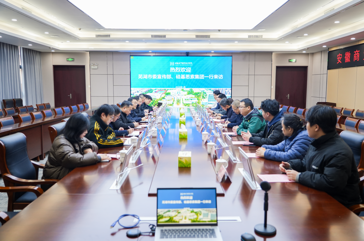 为深化政校企协同育人机制,搭建产学研合作平台,推动教育链、人才链与产业链、创新链深度融合,1月8日下午,芜湖市委宣传部、杭州硅基思索科技(集团)有限公司与我校在求是会议室举行合作对接会议。芜湖市委宣传部、镜湖区委宣传部相关负责人,杭州硅基思索科技(集团)有限公司核心管理团队,以及我校相关领导、部门负责人、艺术设计学院党政班子共同参会。
