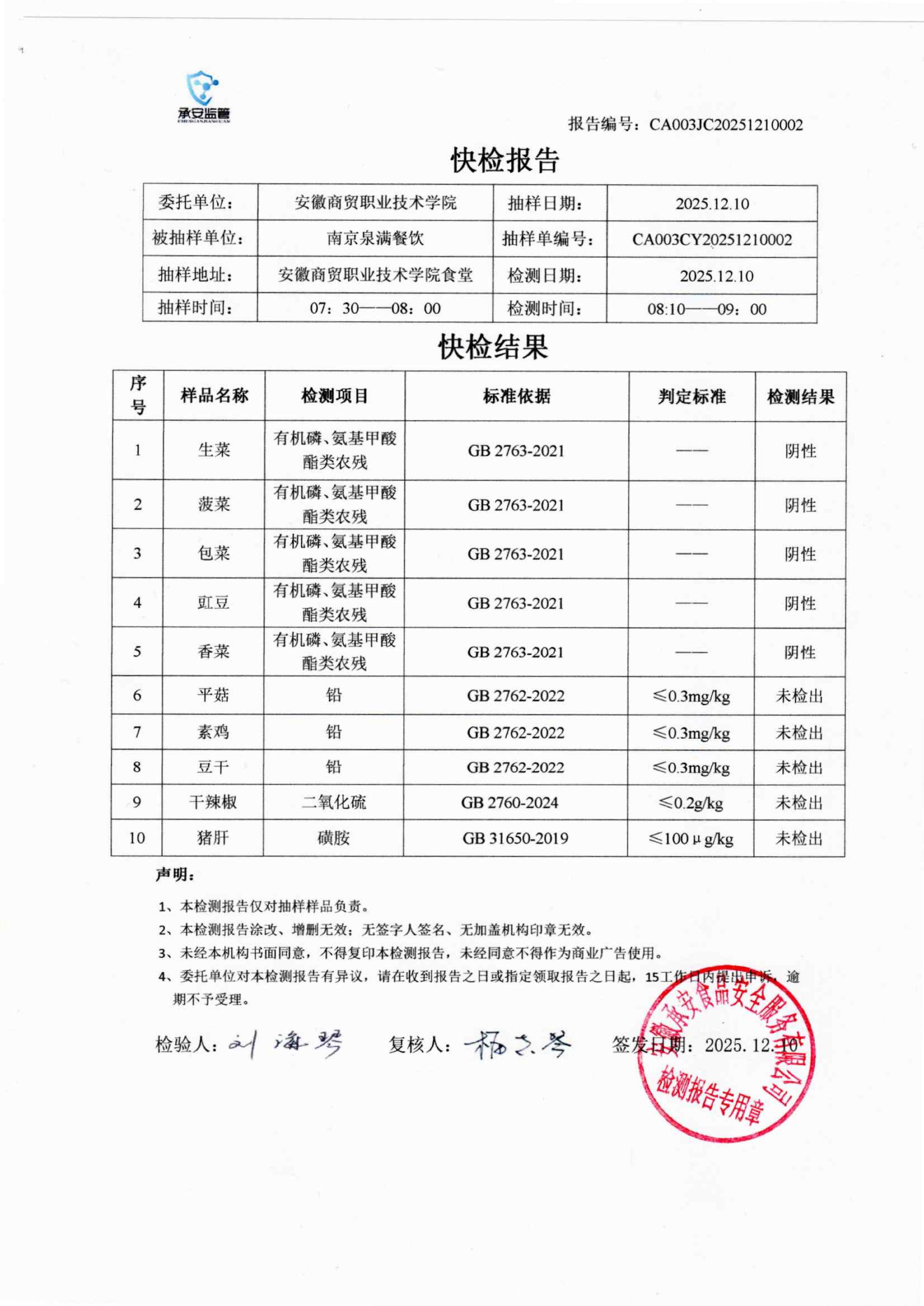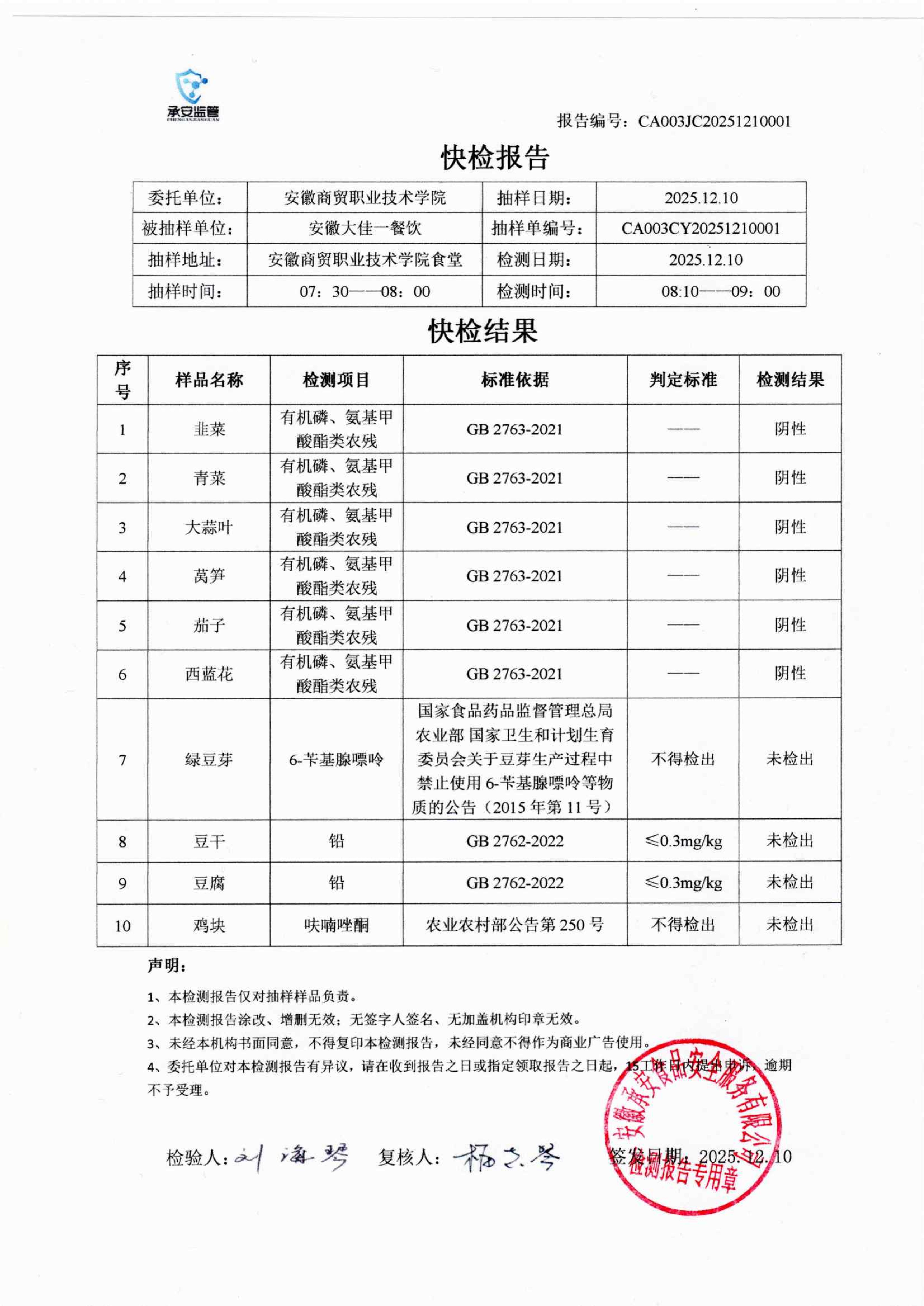 食堂食品原材料快检报告20251210