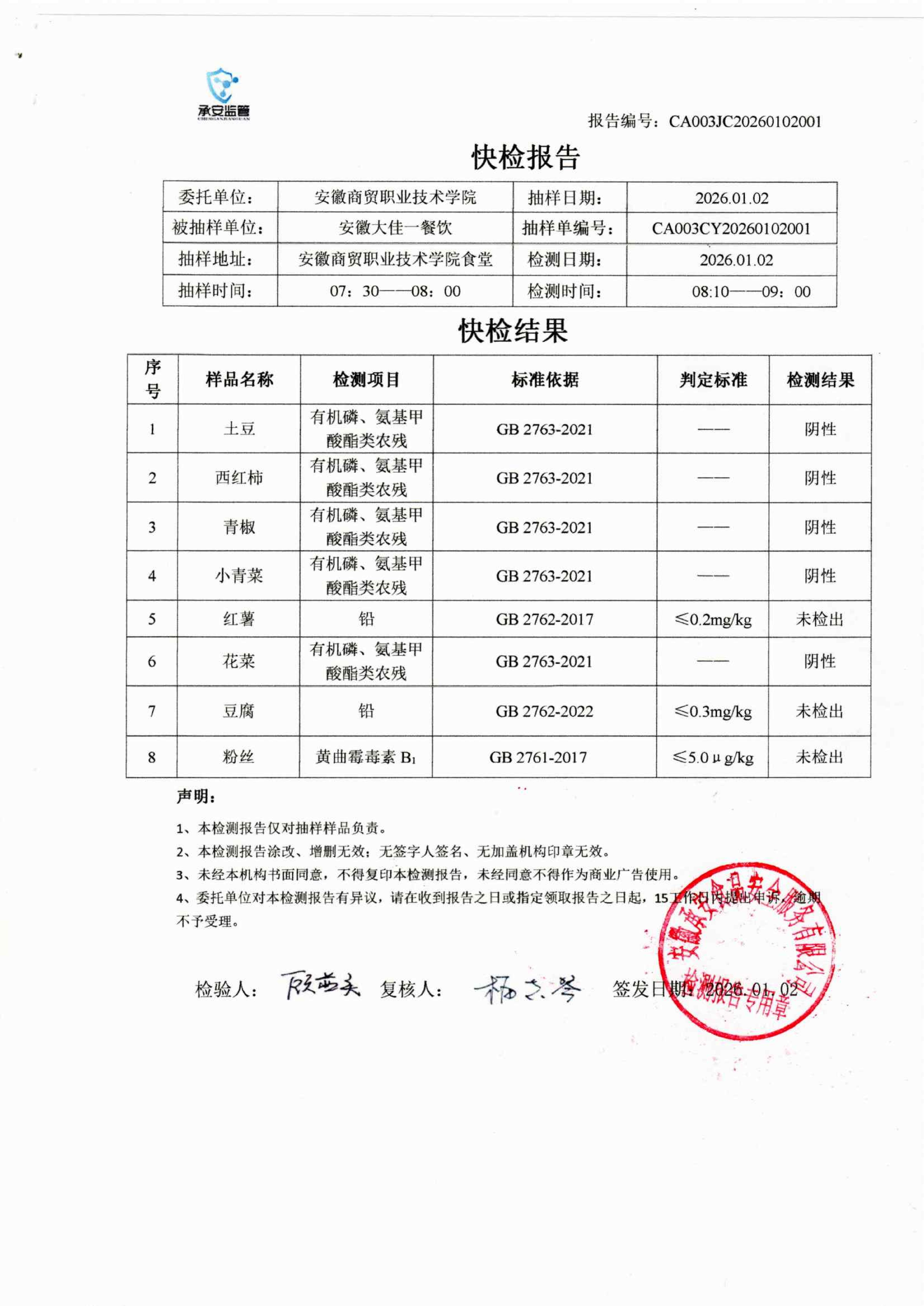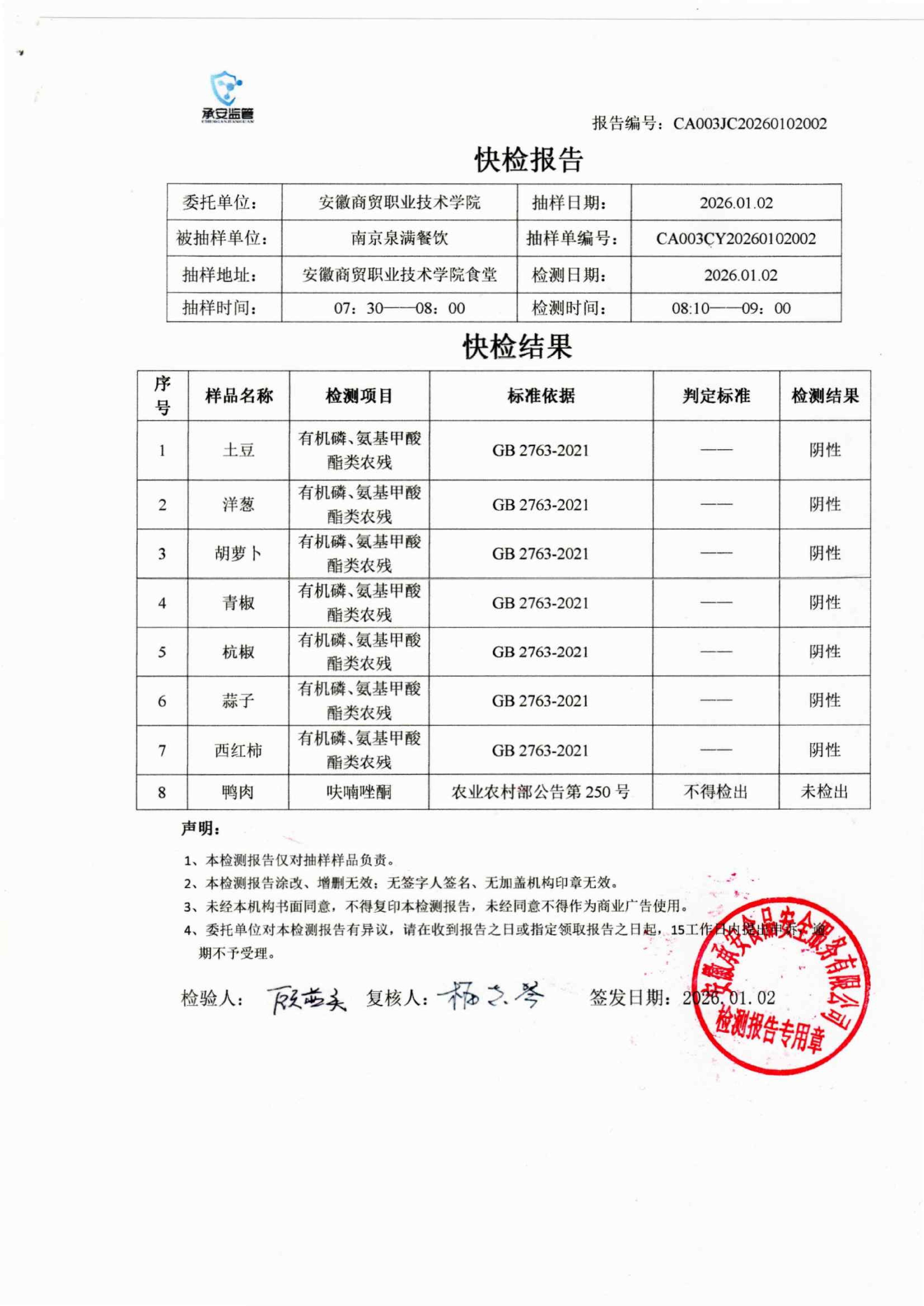 食堂食品原材料快检报告20260102