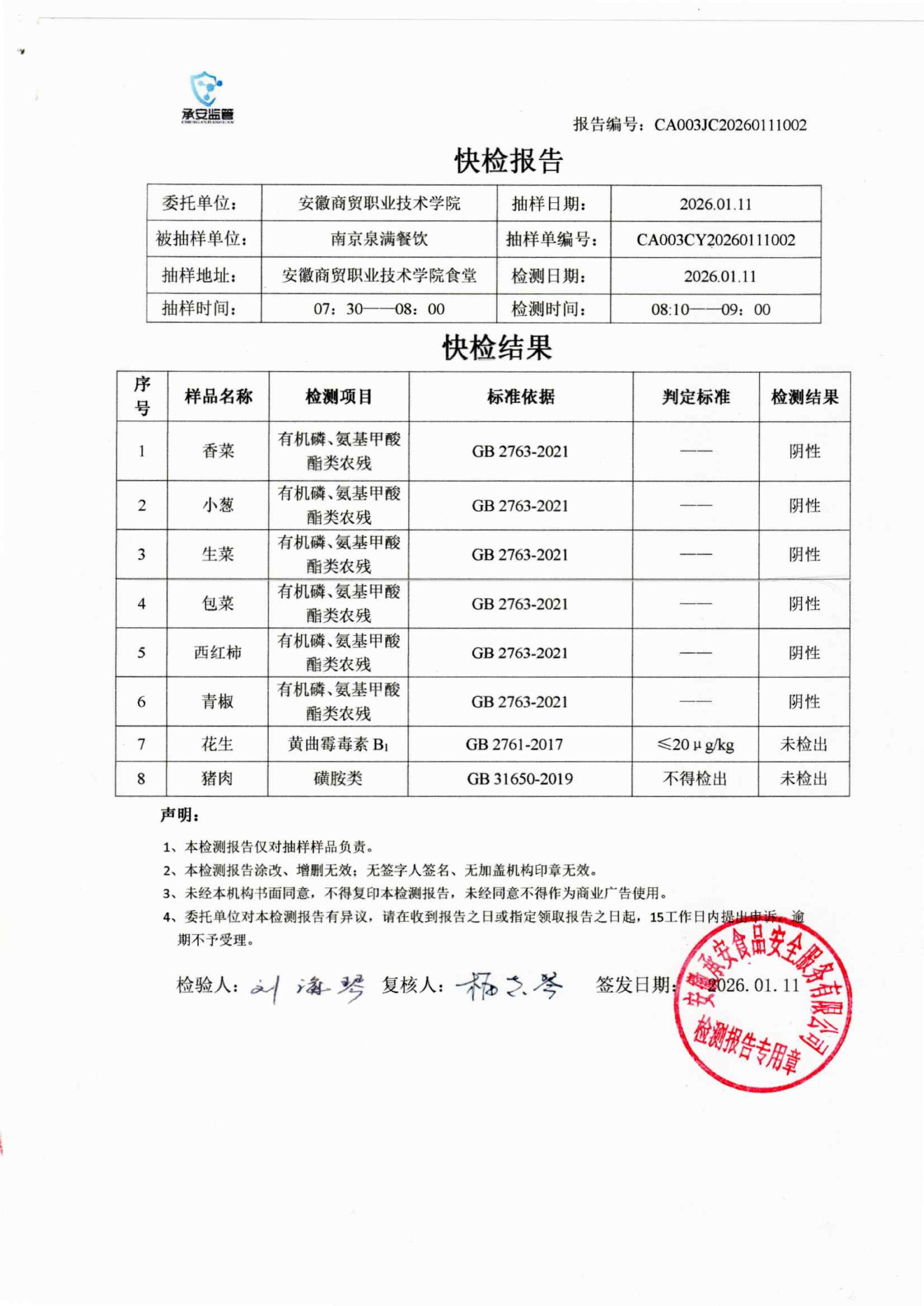 食堂食品原材料快检报告20260111