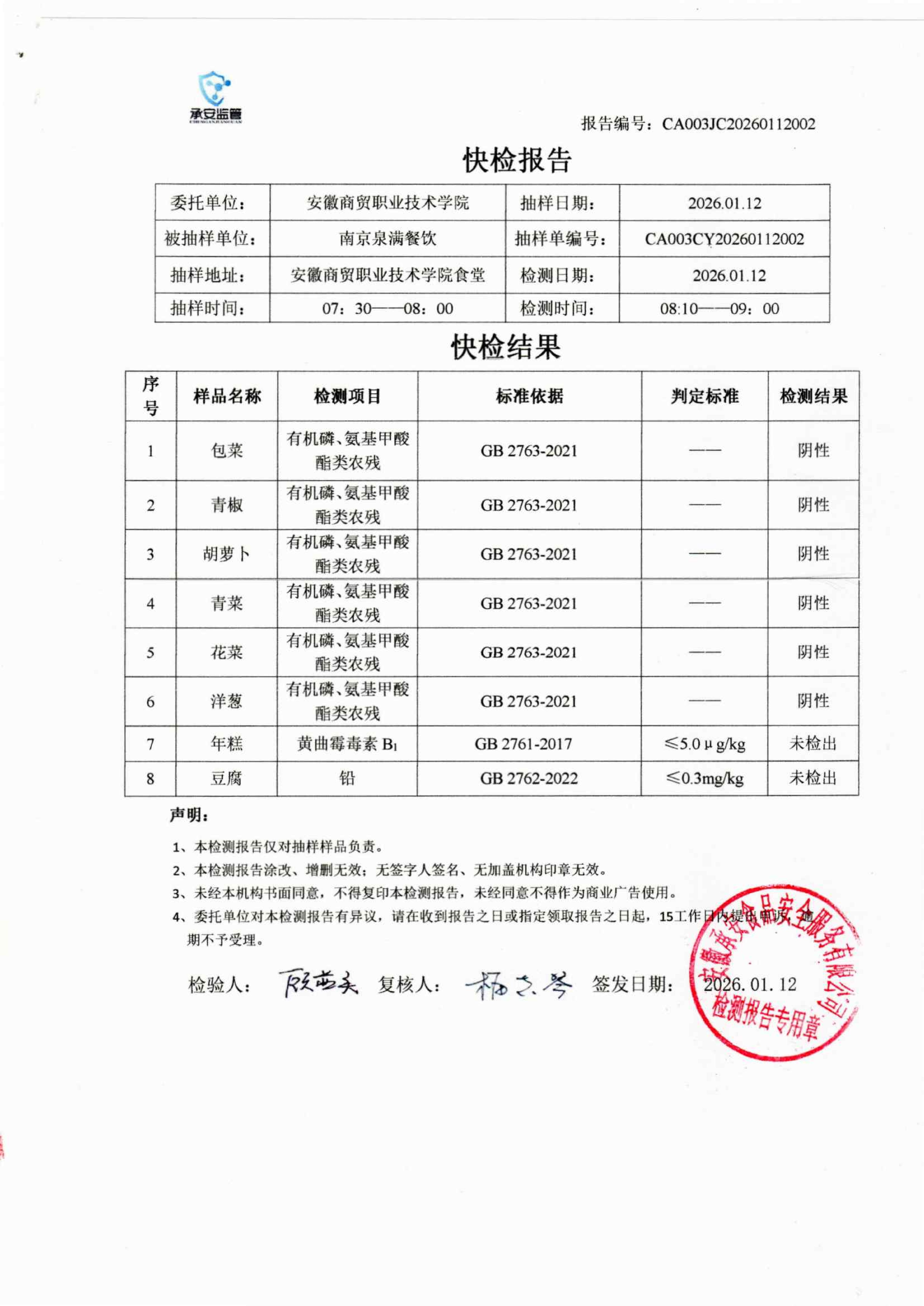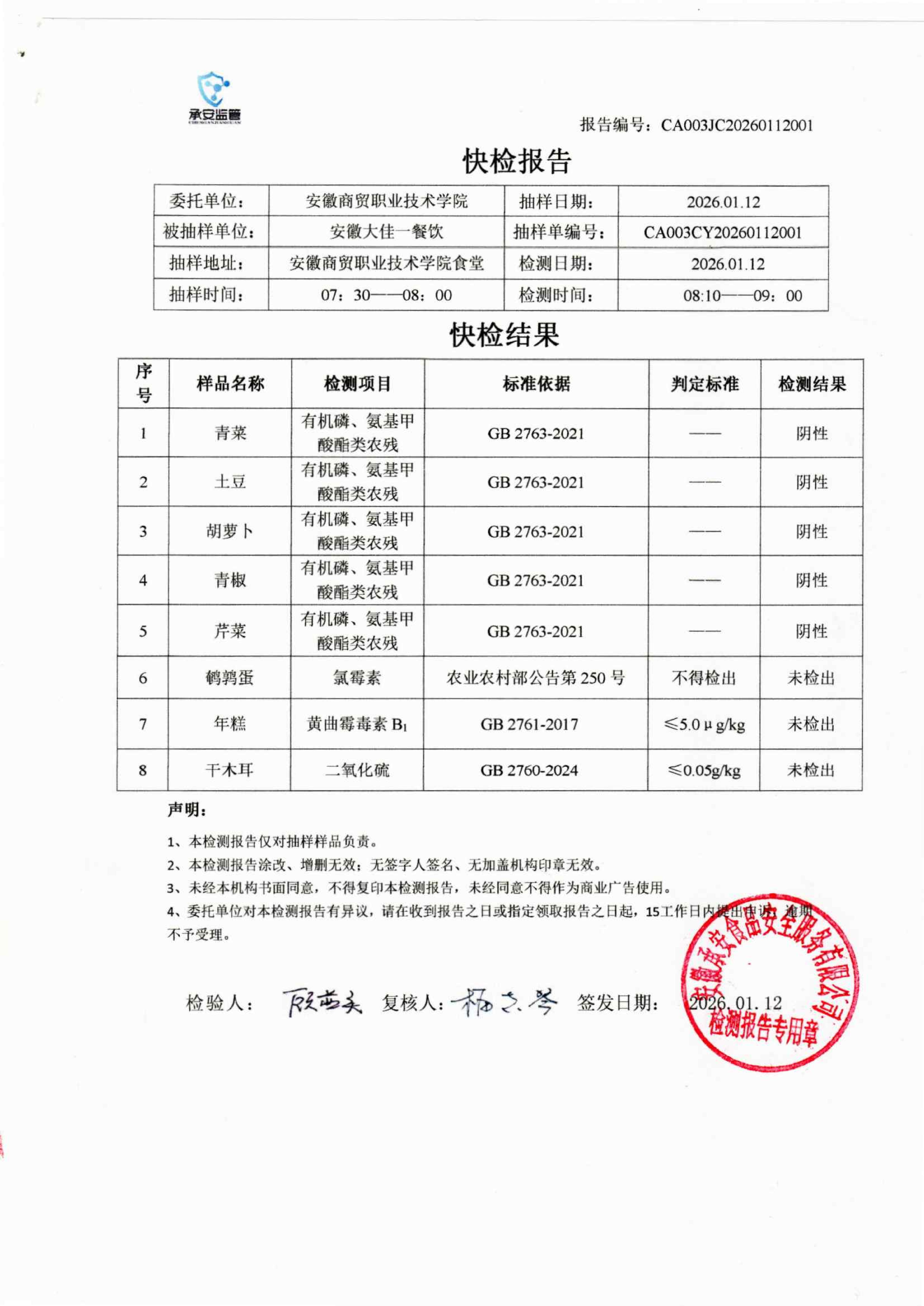 食堂食品原材料快检报告20260112