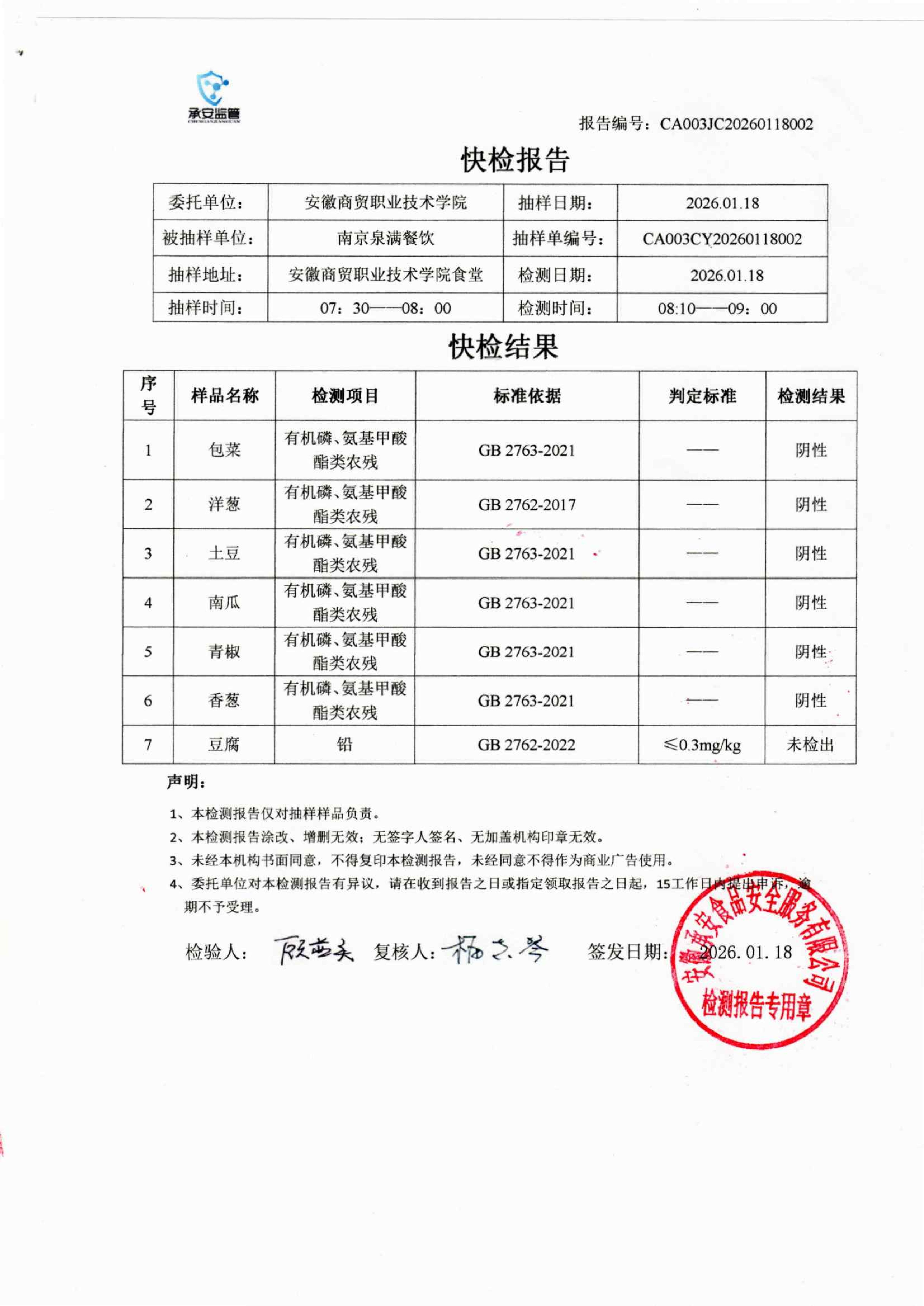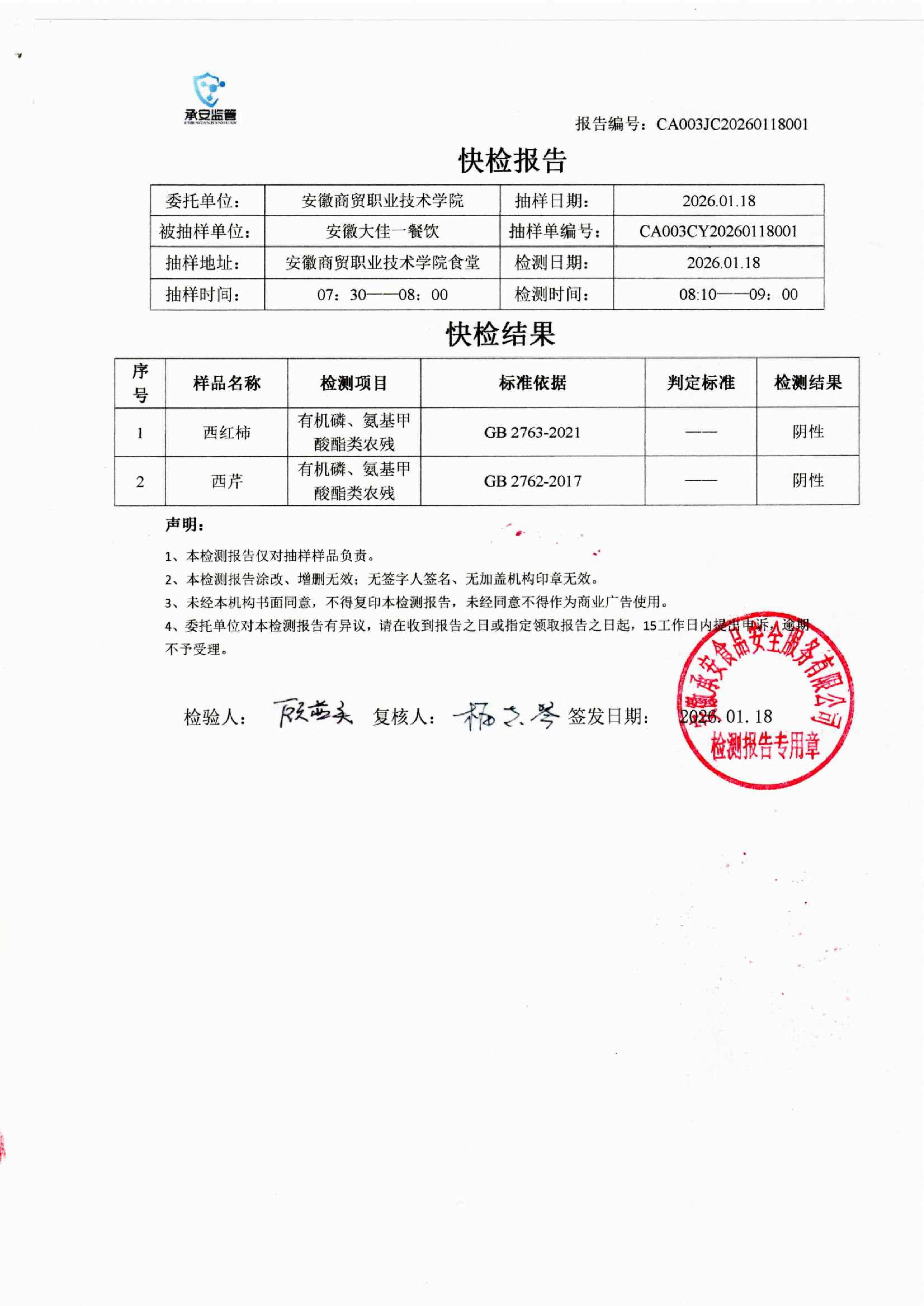 食堂食品原材料快检报告20260118