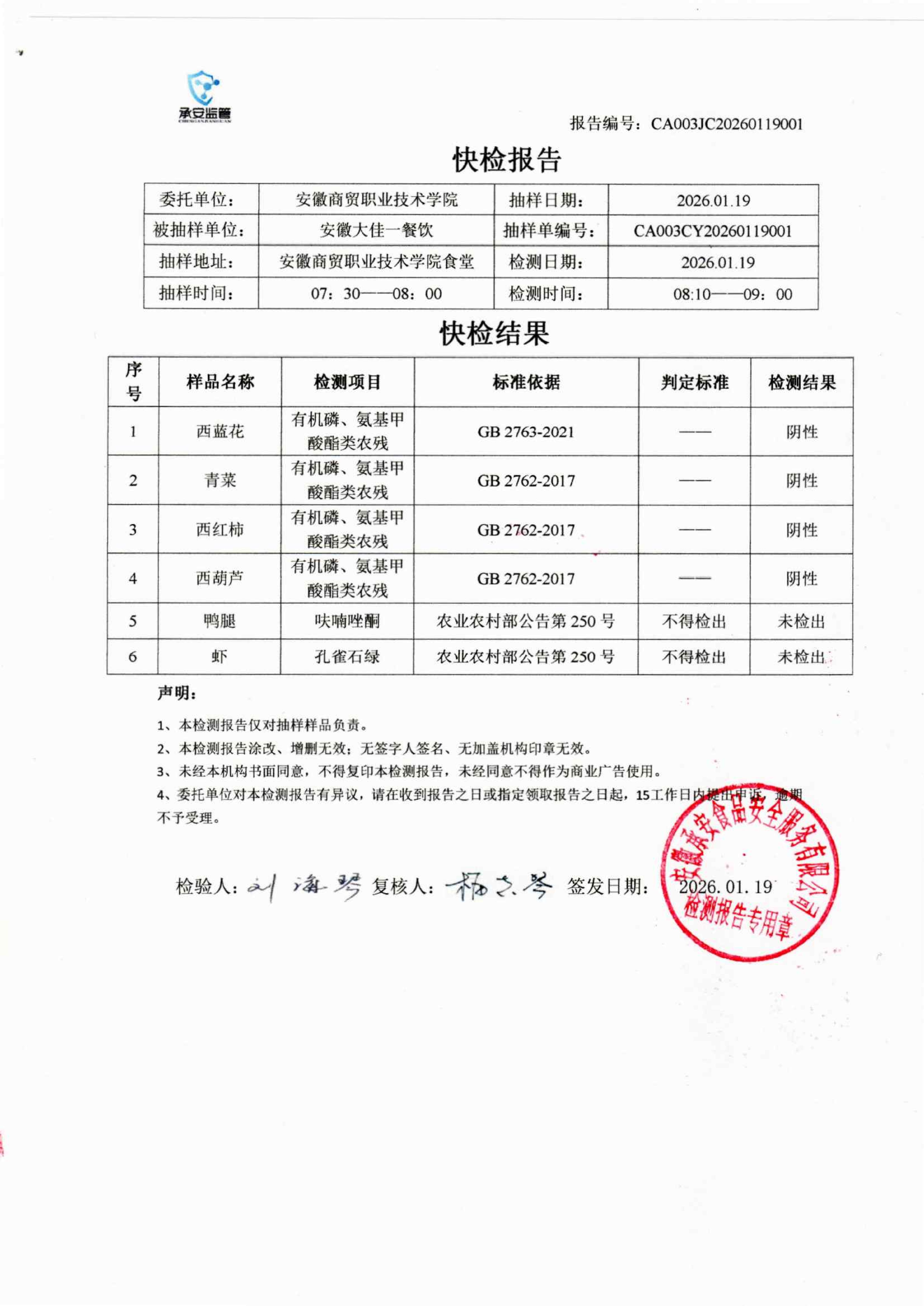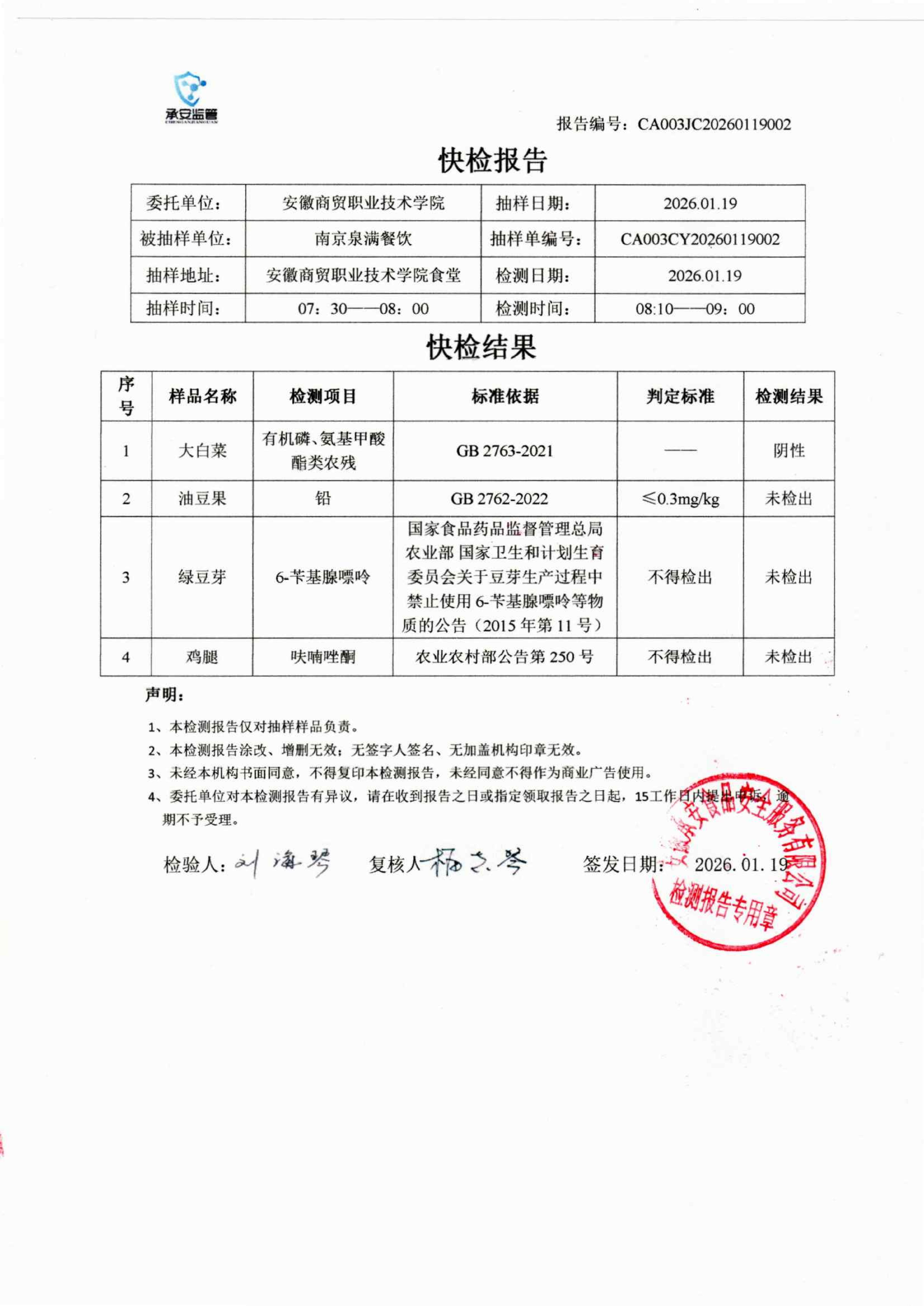 食堂食品原材料快检报告20260119