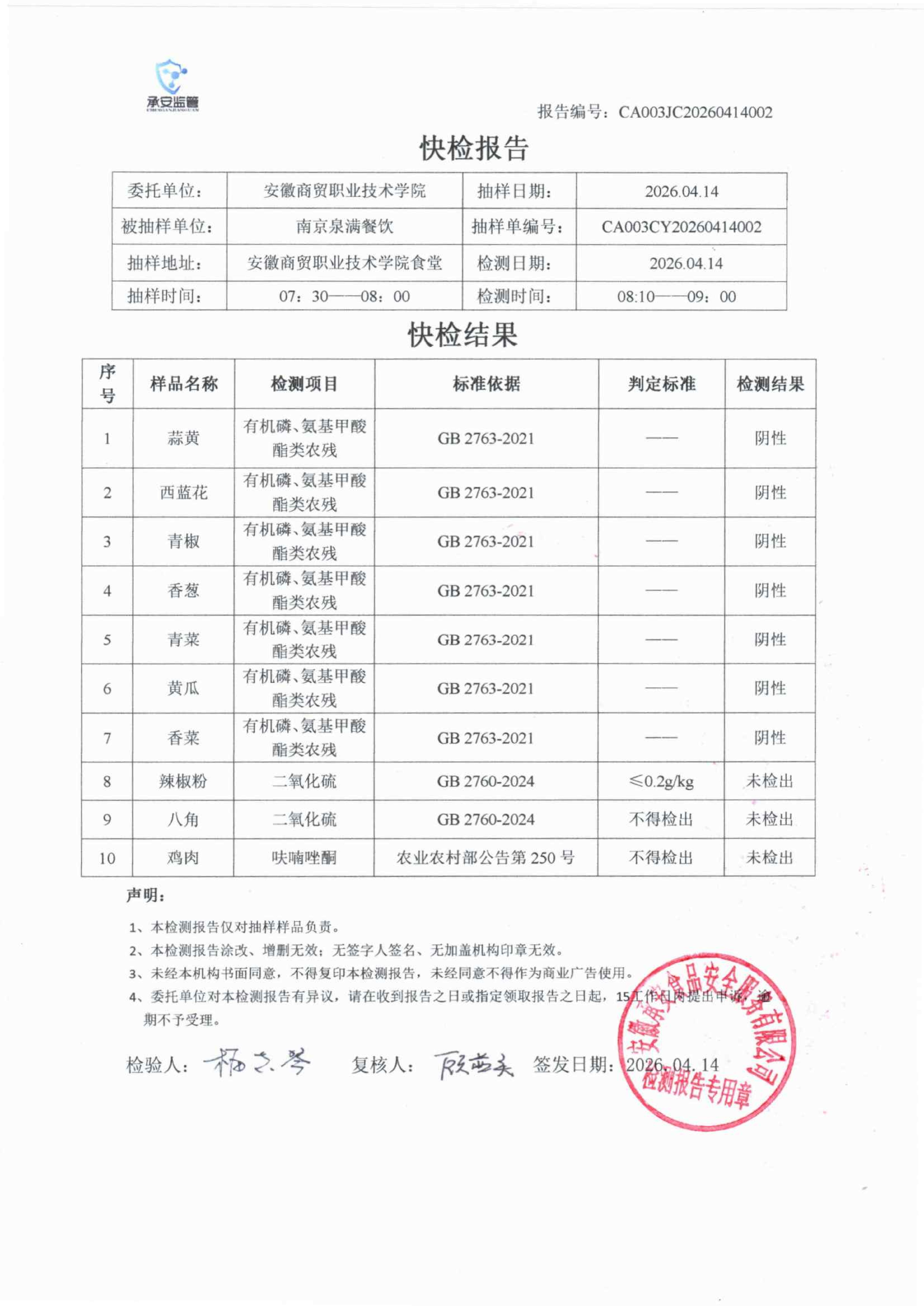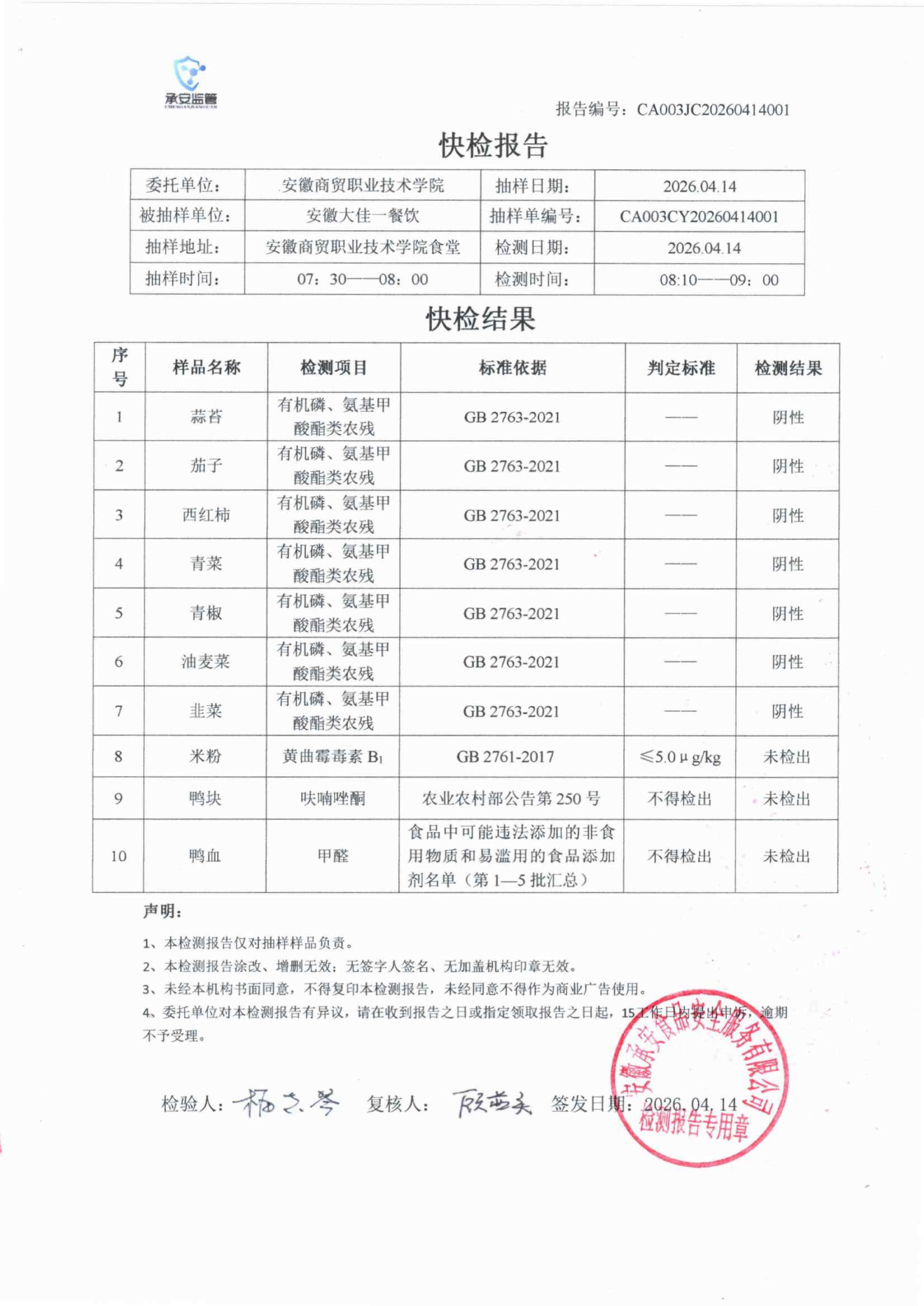 食堂食品原材料快检报告20260414