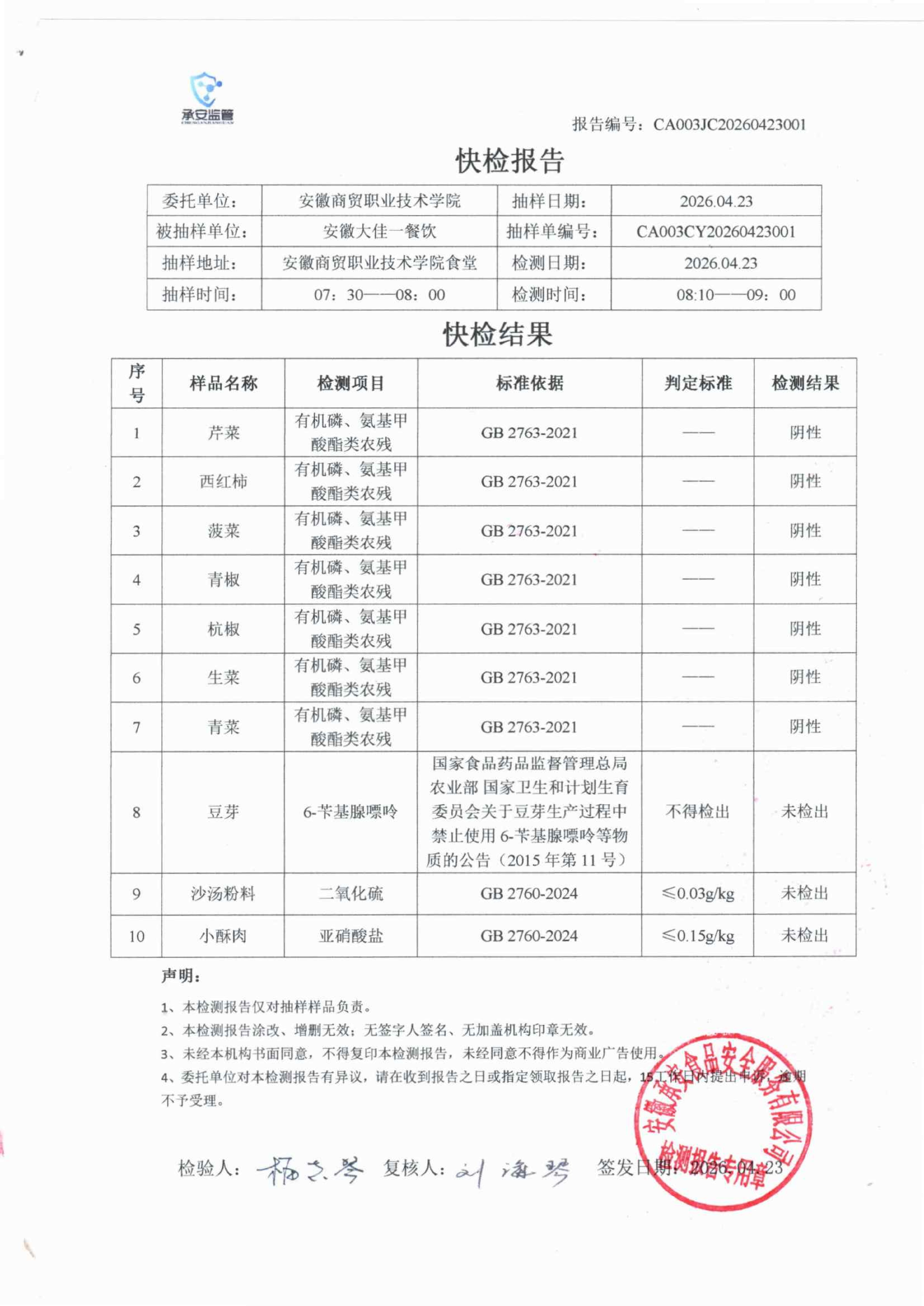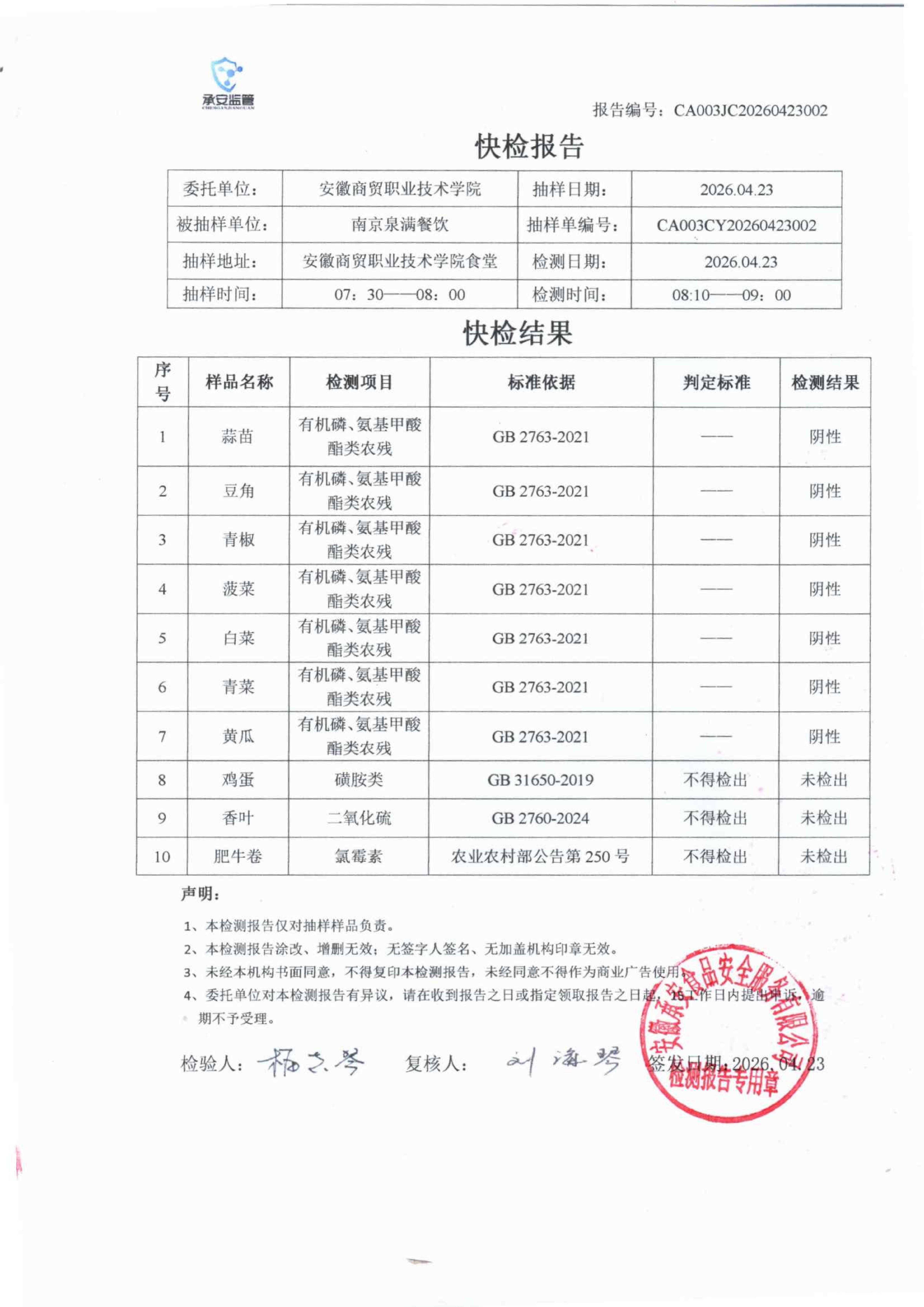 食堂食品原材料快检报告20260423