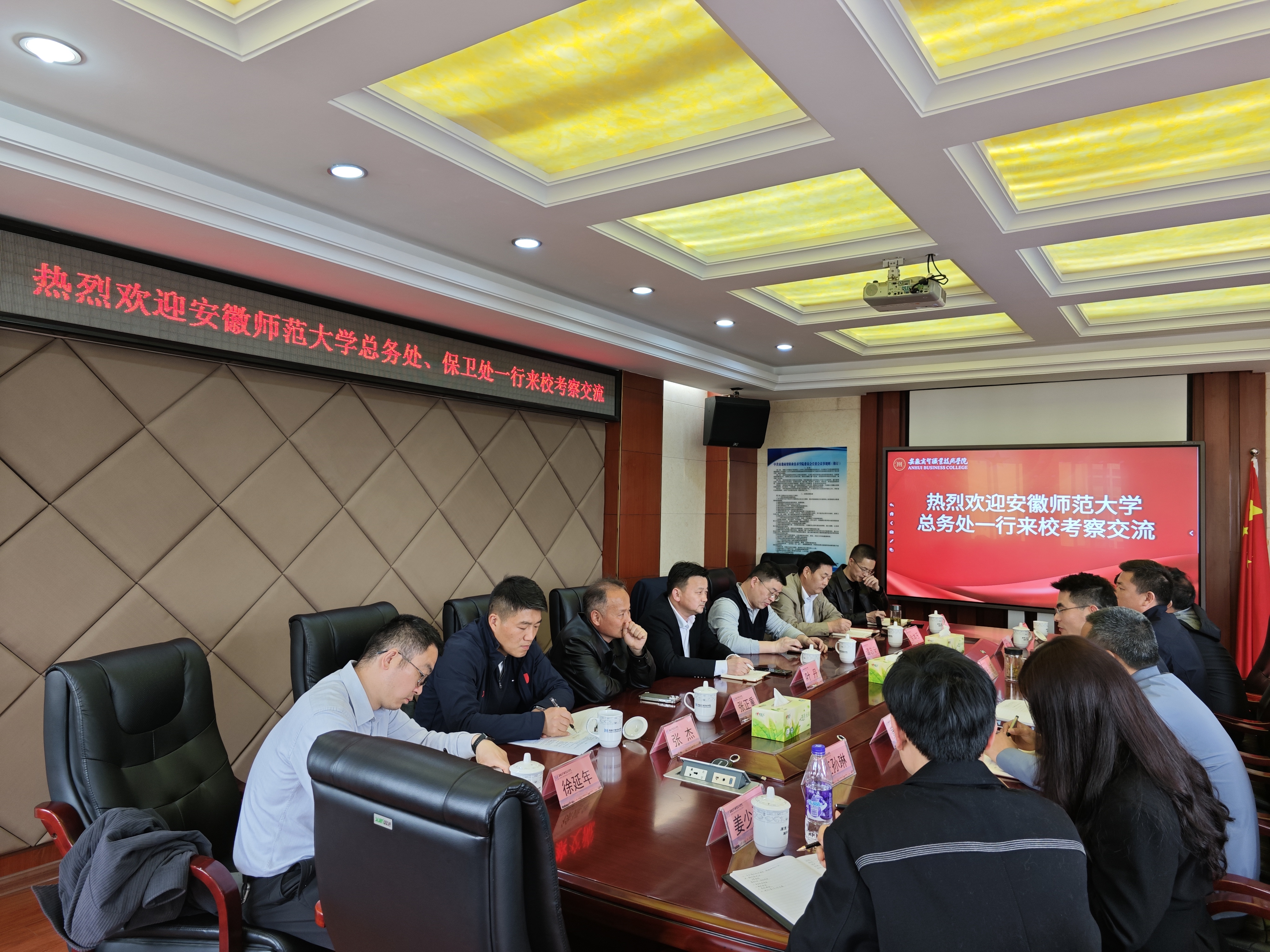 4月2日下午,安徽师范大学总务处党委书记、处长叶丹,保卫处副处长谭志安一行来我校调研交流,我校后勤管理处处长韩成勇、保卫处副处长黄家宏及相关科室工作人员参加座谈会。