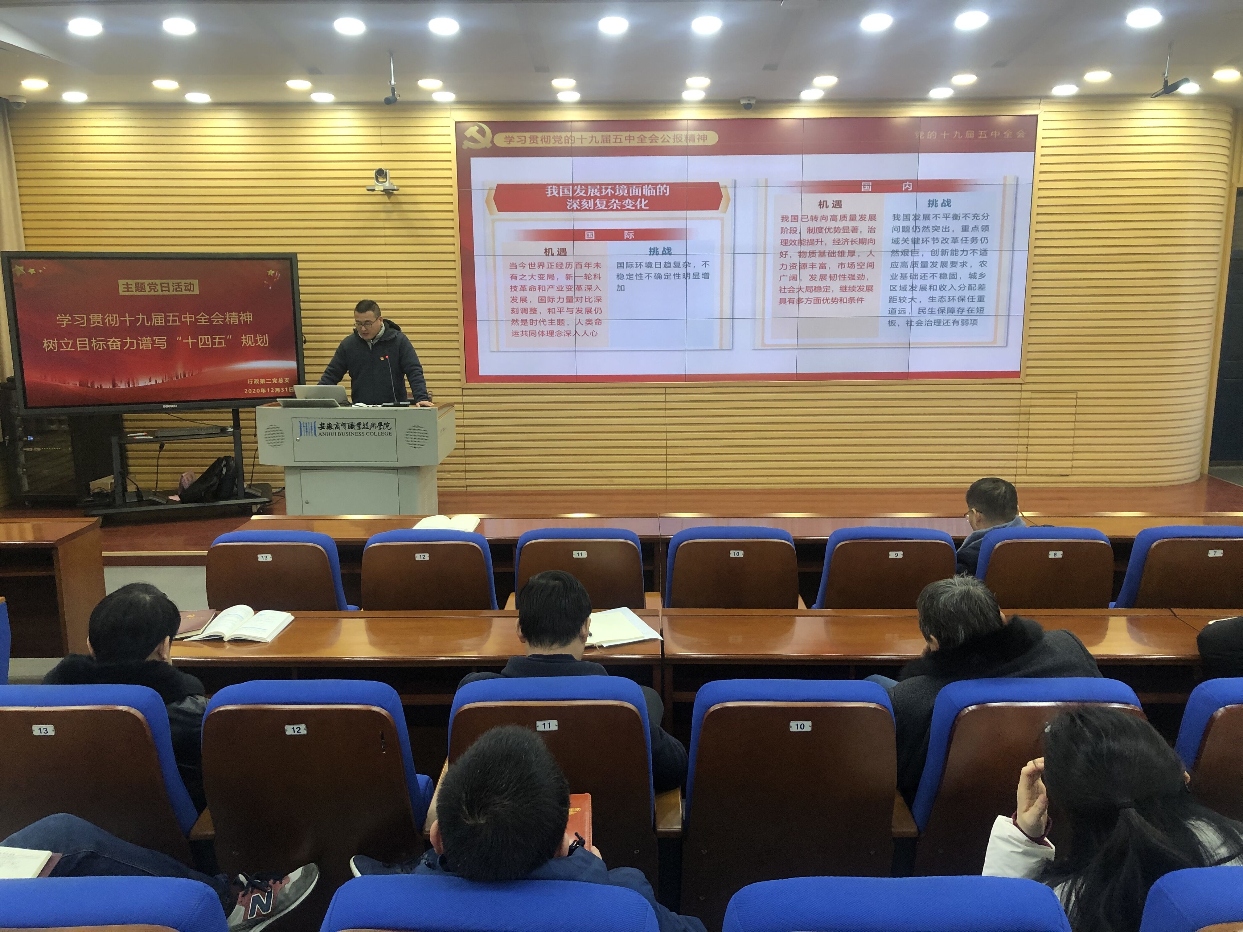 为全面学习领会和认真贯彻党的十九届五中全会精神,进一步学习国家“十四五”规划和二〇三五年远景目标,12月31日下午,行政第二党总支开展了“学习贯彻十九届五中全会精神 树立目标奋力谱写‘十四五’规划”主题党日活动,活动由党总支书记黄义兵主持。