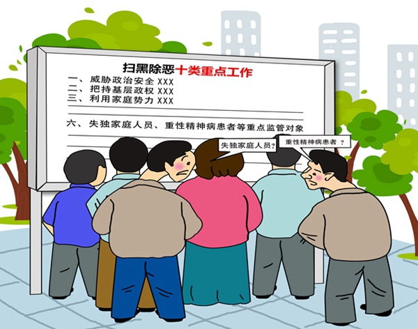 宣传不到位致群众误解。网友“逆风的尘埃”说,一些地方习惯用标语、横幅代替实地宣传,根本不管群众理不理解。在一次检查中,我们询问一位老大娘知不知道扫黑除恶宣传,她说:“知道啊,现在每周都扫,公路很干净。”细问才得知,她把扫黑除恶错误地理解成为了“扫地”的意思。