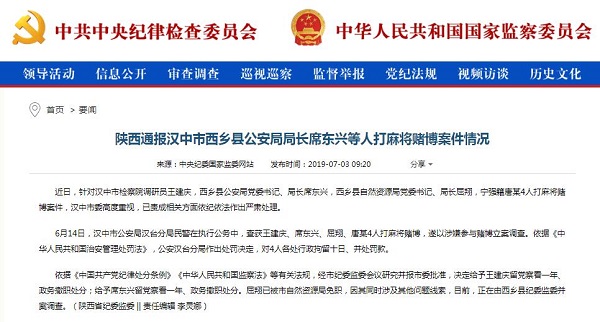 2019年6月,陕西省汉中市检察院调研员、西乡县检察院原检察长王建庆,西乡县公安局党委书记、局长席东兴,西乡县自然资源局党委书记、局长屈翔因打麻将赌博被当地警方查获。三人被行政拘留十日、并处罚款,此后又被给予留党察看一年、政务撤职等处分。
