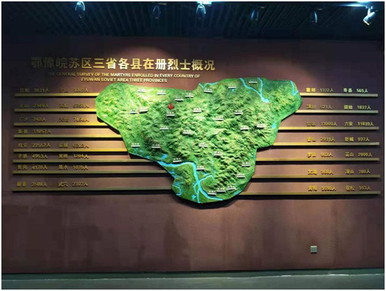 总书记曾驻足观看的这面展墙上,显示了鄂豫皖苏区三省各县在册烈士概况。鄂豫皖苏区是中国共产党在土地革命战争时期领导创建的全国第二大革命根据地。在创建、巩固、发展和保卫革命根据地的过程中,全区先后有200多万人参军参战,有近100万人牺牲,登记在册的烈士为130351人,大部分英烈没有留下姓名。当时,不足10万人的新县就有55000人牺牲。