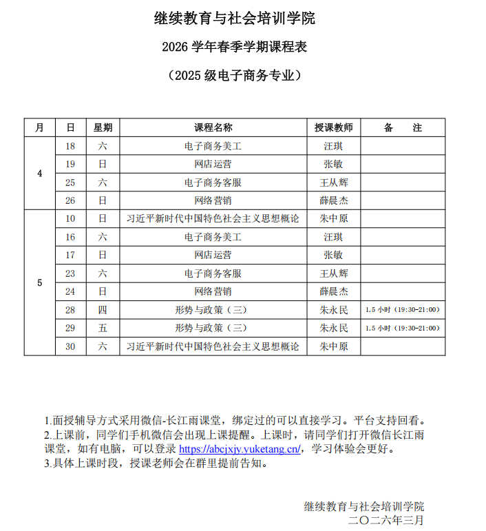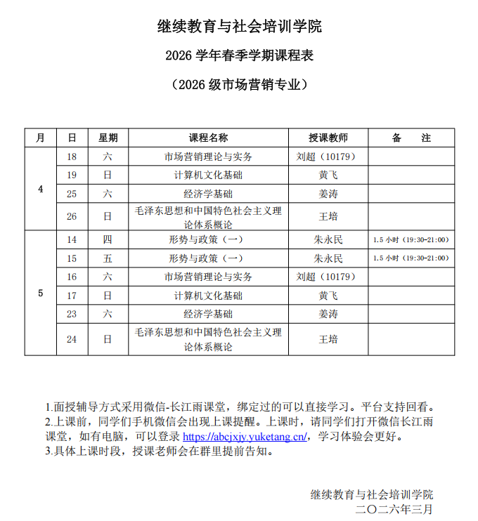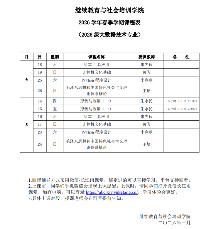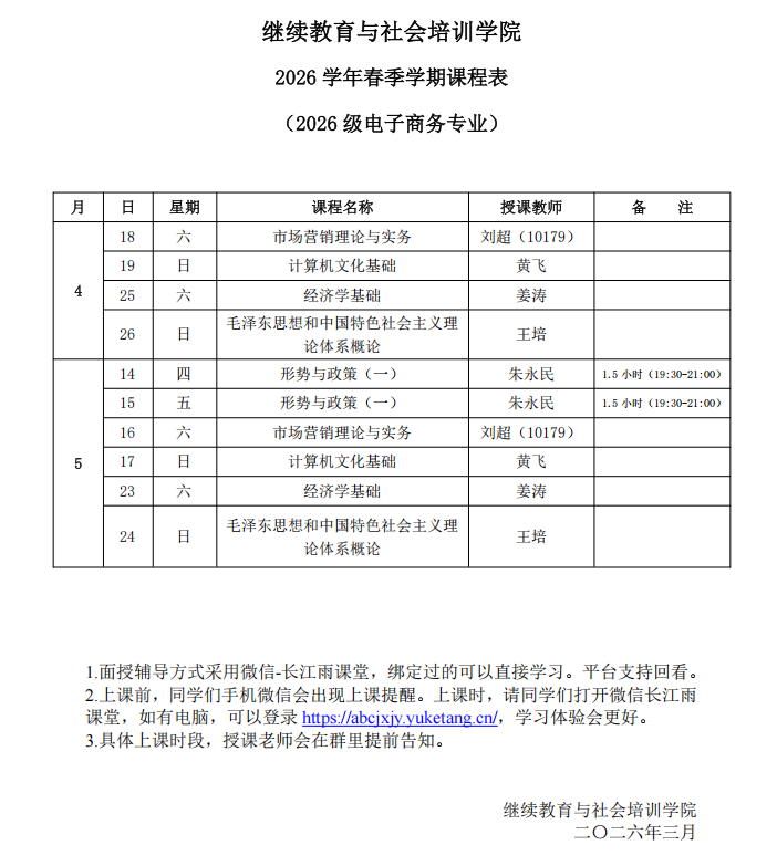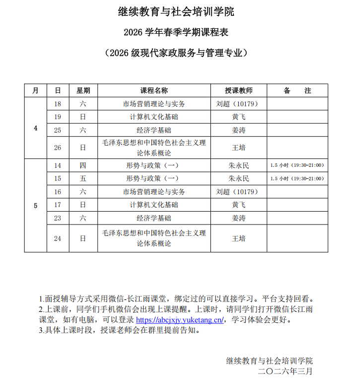 为方便各位老师顺利完成教学任务,现将高等学历继续教育2026年春季学期开课的有关事项通知如下。