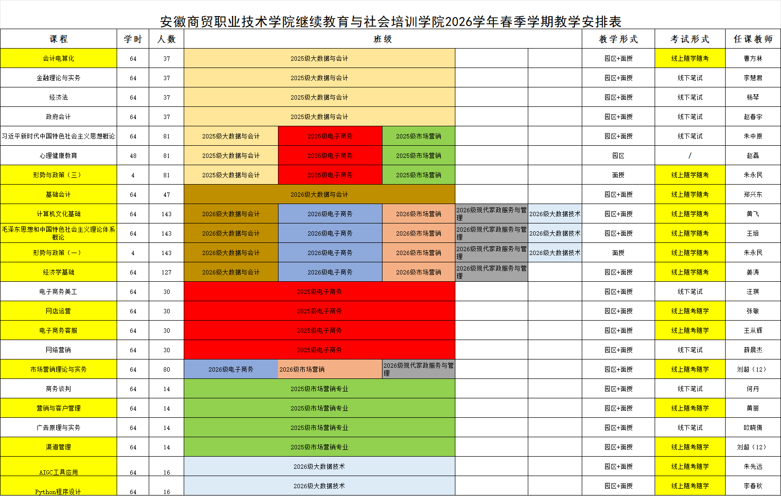 3.线上随学随考的课程(即图中标黄课程),其中2026级新生的所有课程都是线上随学随考,请相关老师注意查看课表。建议线上随学随考课程为客观题,方便平台阅卷。