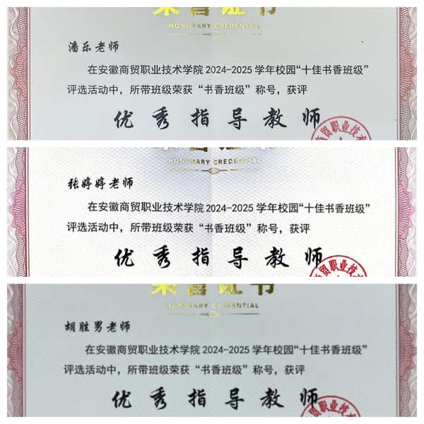 三尺讲台传薪火,书香育人显担当。本次评选中,学院教师团队同样深获认可。潘乐、胡胜男、张婷婷三位老师因在书香班级建设中的悉心指导与无私奉献,被授予“优秀指导老师”荣誉称号。作为班级阅读活动的领航者,三位老师始终立足学生成长需求与专业人才培养目标,巧妙将专业知识与经典阅读深度融合,既引导学生在传统文化典籍中汲取修身之道,又带领学子在专业前沿著作中探索行业发展脉络,让阅读成为提升学生人文素养与专业能力的“双重引擎”。