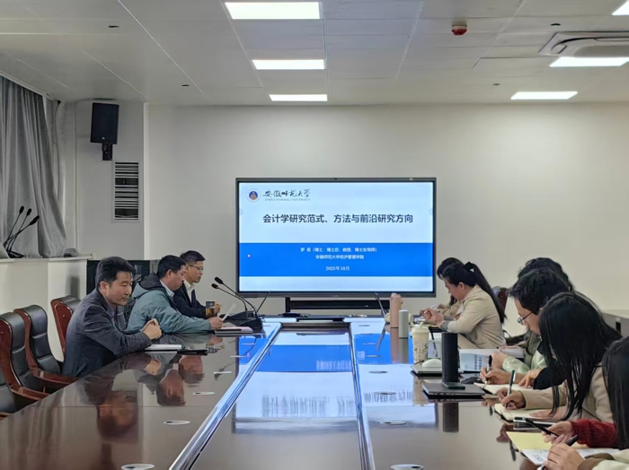 为系统提升教师科研能力,营造浓厚学术氛围,10月28日下午,会计学院举办2025年第三期学术沙龙。本次活动特邀安徽师范大学博士生导师罗昆教授作题为“会计学研究范式、方法与前沿研究方向”的专题讲座。讲座由会计学院院长鲁学生主持,学院博士及在读博士教师、新进教师、安徽机电职业技术学院教师等共同参与。