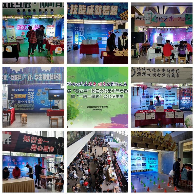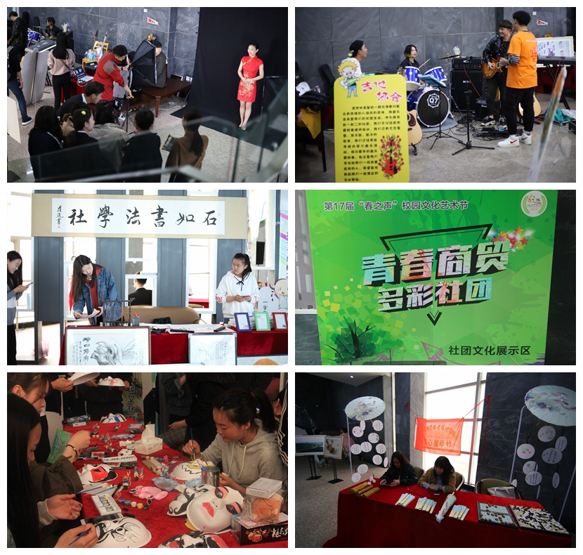 启动仪式后,现场的师生共同参观了系部和社团的特色展示,这也是本届春之声启动仪式的创新举措,旨在通过集中特色展示活动,加强交流学习,为各系及社团逐步打造并形成文化品牌提供实践经验,推动校园文化建设。“春之声”展区将历届文化艺术节的成果进行集中展示,百年安商、立德树人,十六载“春之声”校园文化艺术节培育德才兼备商贸人。七个系部和校园社团紧扣自身特色,精心布展,通过丰富多彩的专业文化展示和体验活动接纳观展的师生,如经济贸易系的“校企互融、协同育人”,三只松鼠玩偶和义卖活动吸引参观师生驻足;会计系的“会计技能成就梦想”,点钞技能展示令参观者叹服;艺术设计系的“描绘艺术,装点人生”,观展的同学纷纷加入现场手绘队伍中;财务金融系的“了解金融、学习金融、走进金融”,同学们饶有兴致的参加模拟理财投资游戏;电子信息工程系的“专业互联网+‘鲜’,学生职业技能强”,体感交互游戏带你感受虚拟现实;人文外语系的“传统文化走进新时代,灿烂文明书写新篇章”,展示着浓浓的中华优秀传统文化;工商管理系的“知行合一,用心服务”,现场调酒和茶艺展示吸引着大家的目光;在社团展区,书法协会、摄影协会、航模协会等都将各自的特色风采进行了展示,多彩的社团和青春的商贸相得益彰。商贸百年的文化根基培育出不同的风采展示,集中展现了学校的育人成果,展示商贸学子的风采。启动仪式现场人头攒动、秩序井然,让在场师生真正感受到充满商贸特色的校园文化和魅力。观展同学们在微博中写道:“参加此次活动受益匪浅,激发了对于学校和系部专业的热爱,给予我们拼搏奋进的力量”。本次活动通过多个网络平台进行直播,和广大师生一同分享现场活动的精彩画面。