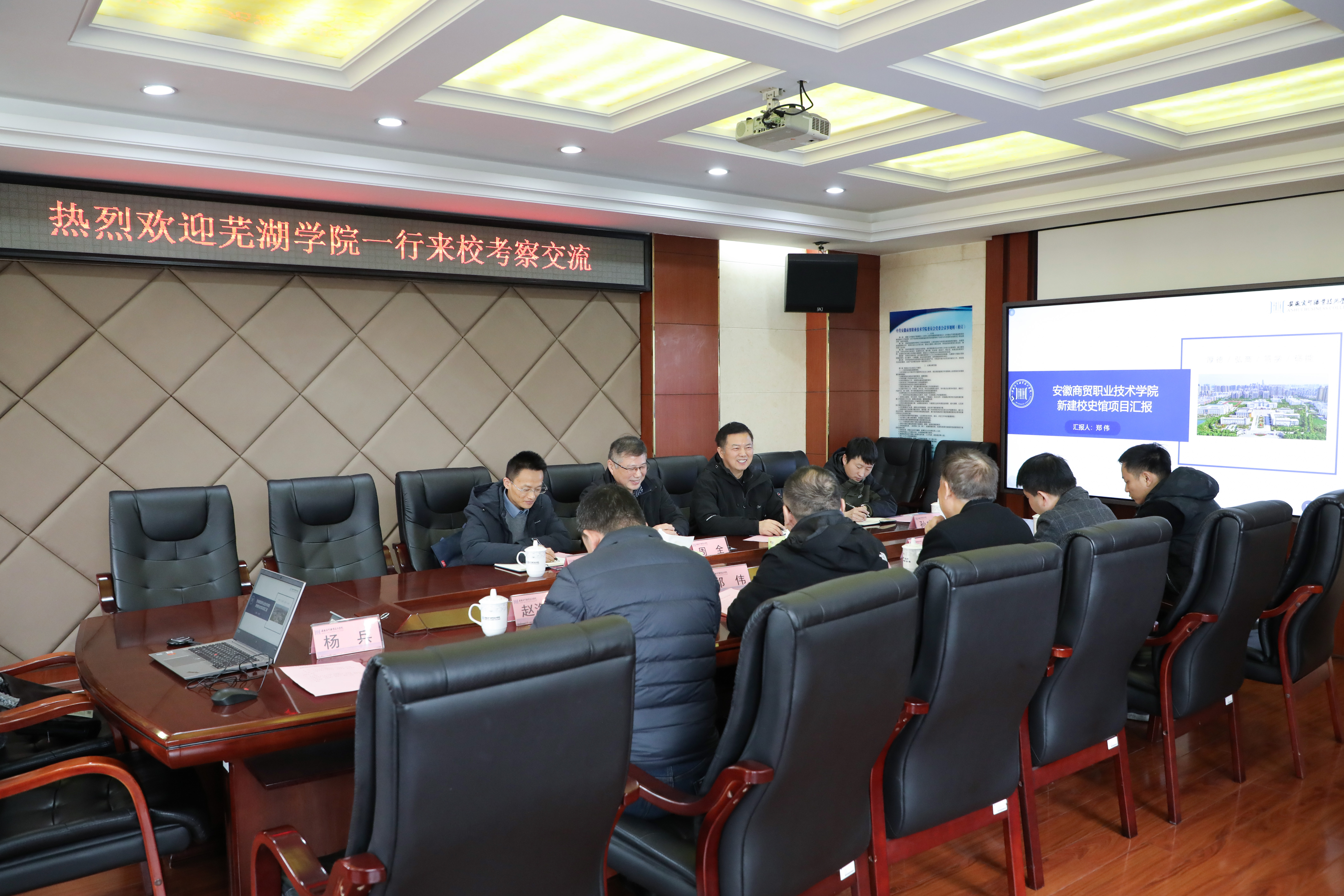 周全对我校的热情接待表达了谢意,并对我校近年来在办学上取得的成绩给予了高度赞誉。他简要介绍了芜湖学院的基本情况及此次来访的主要目的,表达了校史馆建设对于芜湖学院的重要意义。黄亮在发言中表示,希望通过此次调研交流,借鉴我校在校史馆建设的招投标、设计、施工、布展、设备购置、维护等关键环节的先进经验,助力芜湖学院校史馆建设项目顺利推进。
