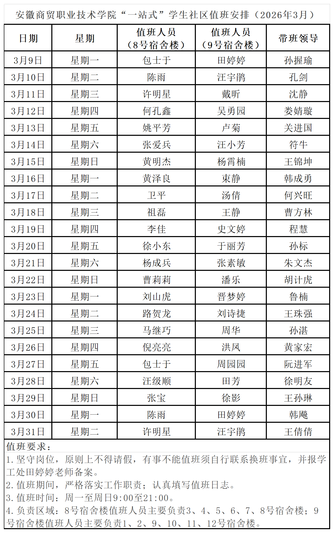 2026年3月“一站式”学生社区值班安排