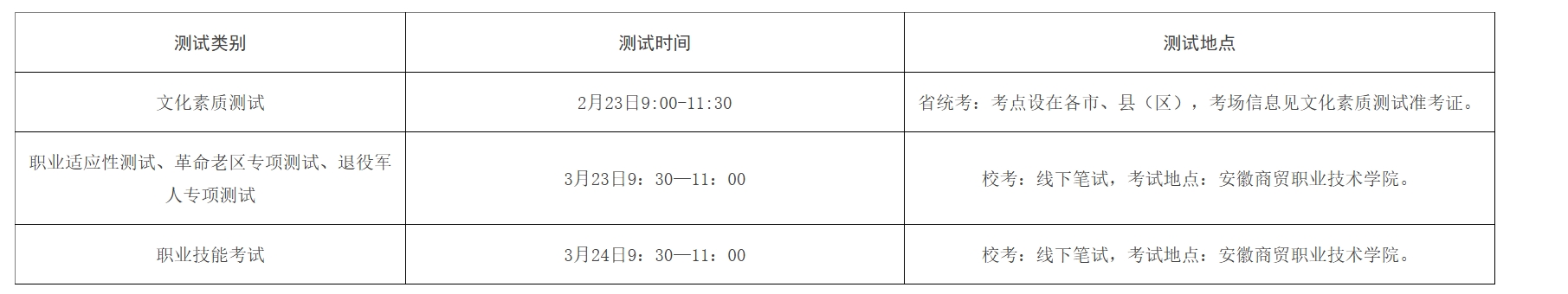 考生须参加文化素质测试,文化素质测试由全省统一组织、统一划定合格线,达线考生方可参加学校组织的职业适应性测试或职业技能考试。其中,经安徽省教育考试院资格审核通过的退役军人考生,如报考退役军人专项计划,则免于参加文化素质测试,直接参加我校组织的退役军人专项测试,如报考其它普通计划,则须参加文化素质测试,并根据其毕业类型参加我校的职业适应性测试或职业技能考试。