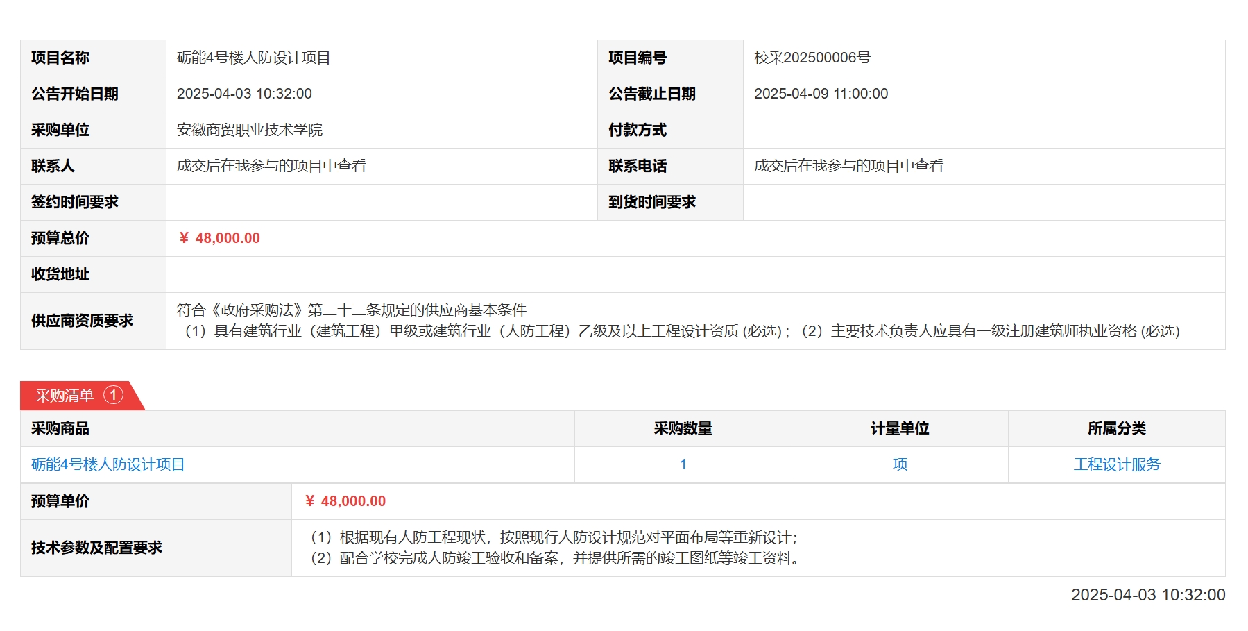 砺能4号楼人防设计项目(校采202500006号)采购公告