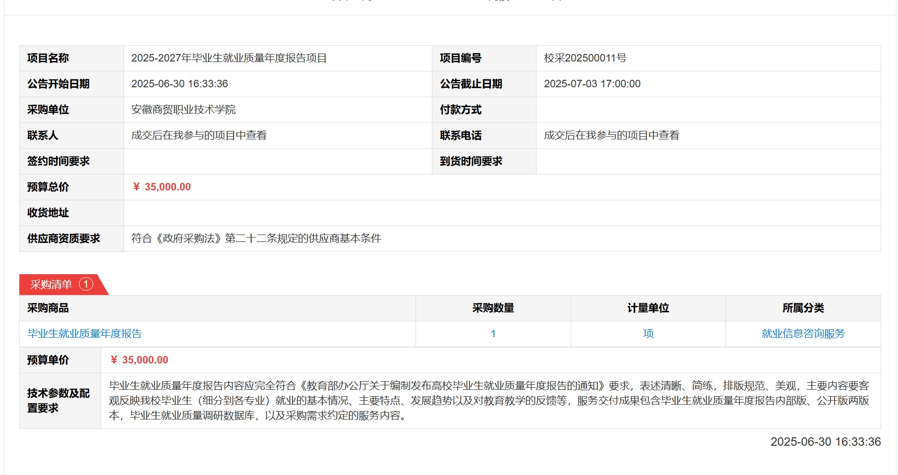 2025-2027年毕业生就业质量年度报告项目(校采202500011号)采购公告