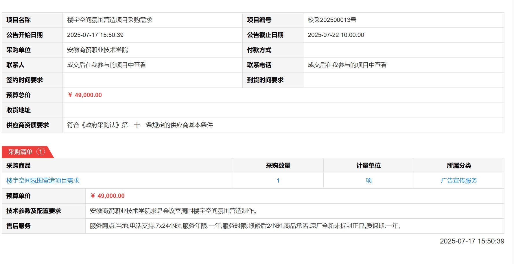 楼宇空间氛围营造项目采购需求(校采202500013号)采购公告