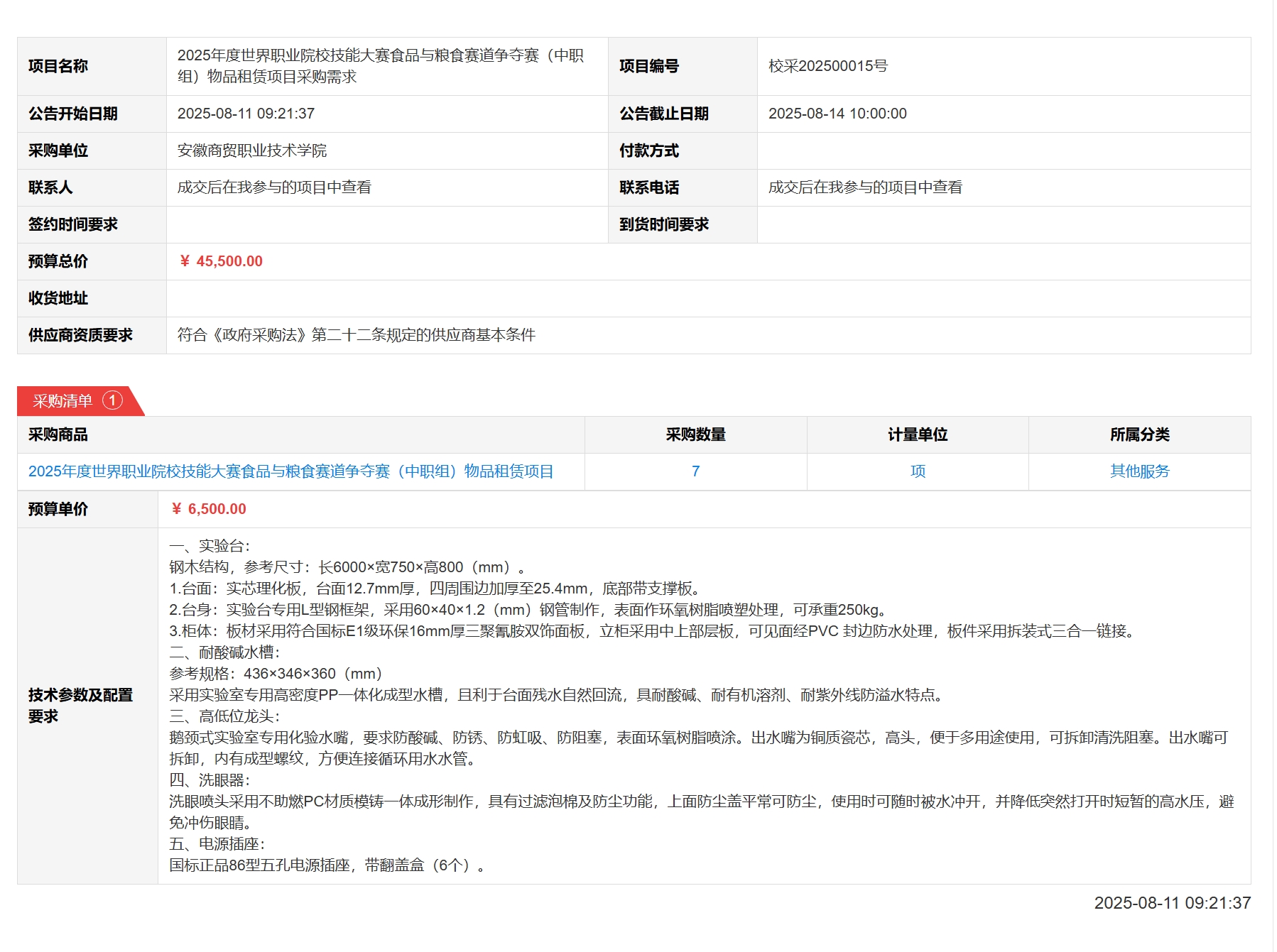 2025年度世界职业院校技能大赛食品与粮食赛道争夺赛(中职组)物品租赁项目采购需求(校采202500015号)采购公告