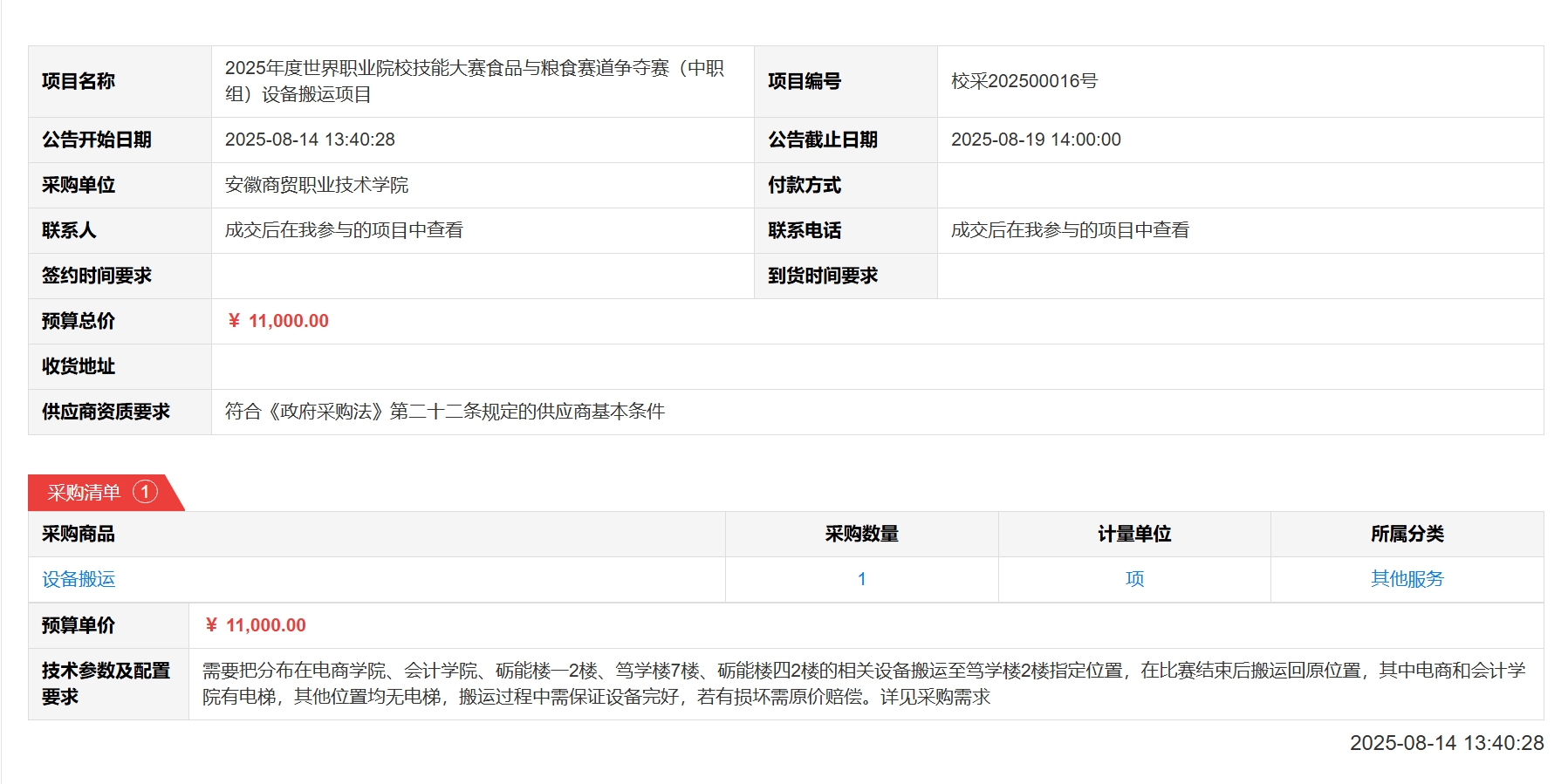 2025年度世界职业院校技能大赛食品与粮食赛道争夺赛(中职组)设备搬运项目(校采202500016号)采购公告