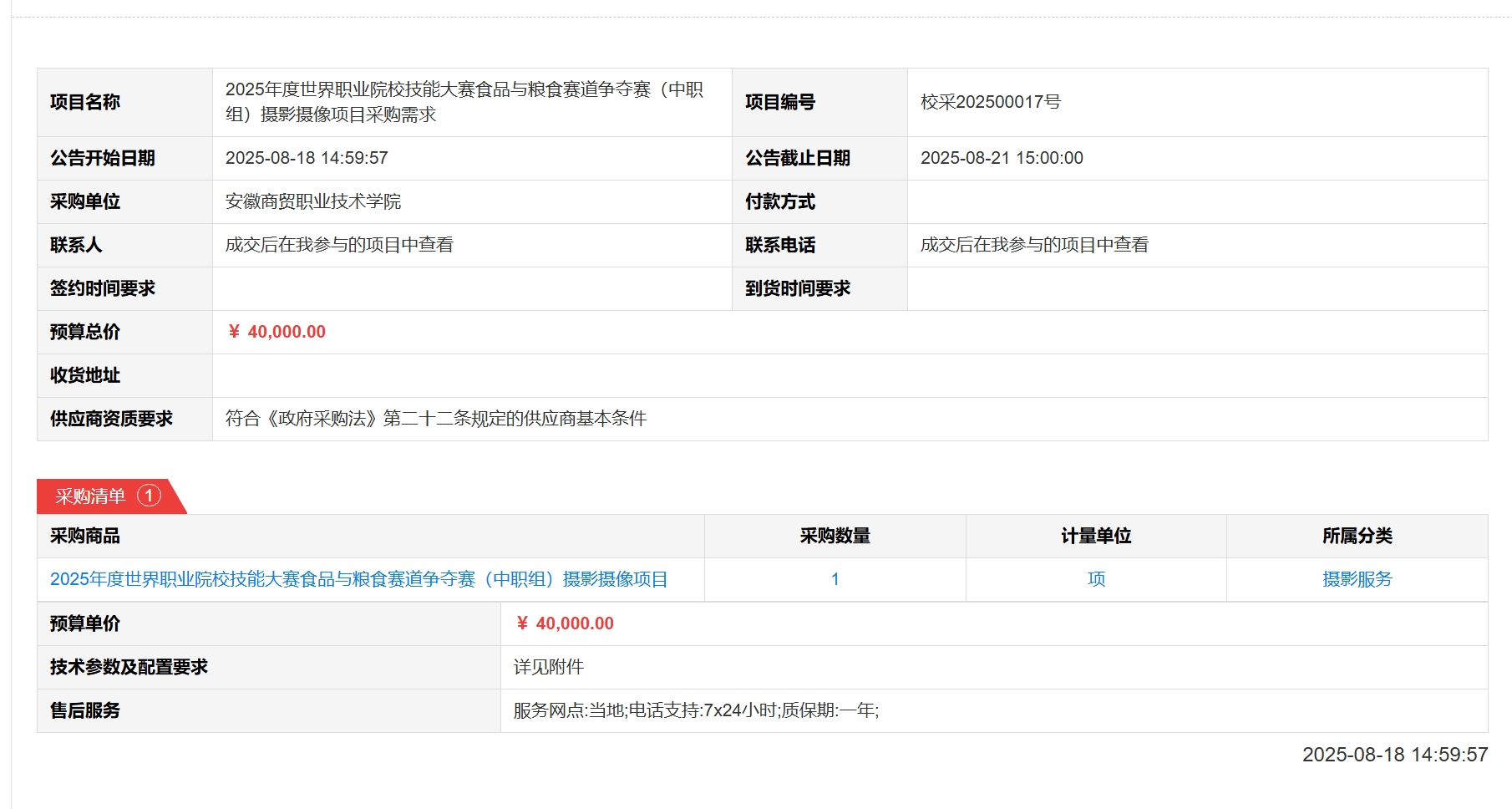 2025年度世界职业院校技能大赛食品与粮食赛道争夺赛(中职组)摄影摄像项目采购需求(校采202500017号)采购公告
