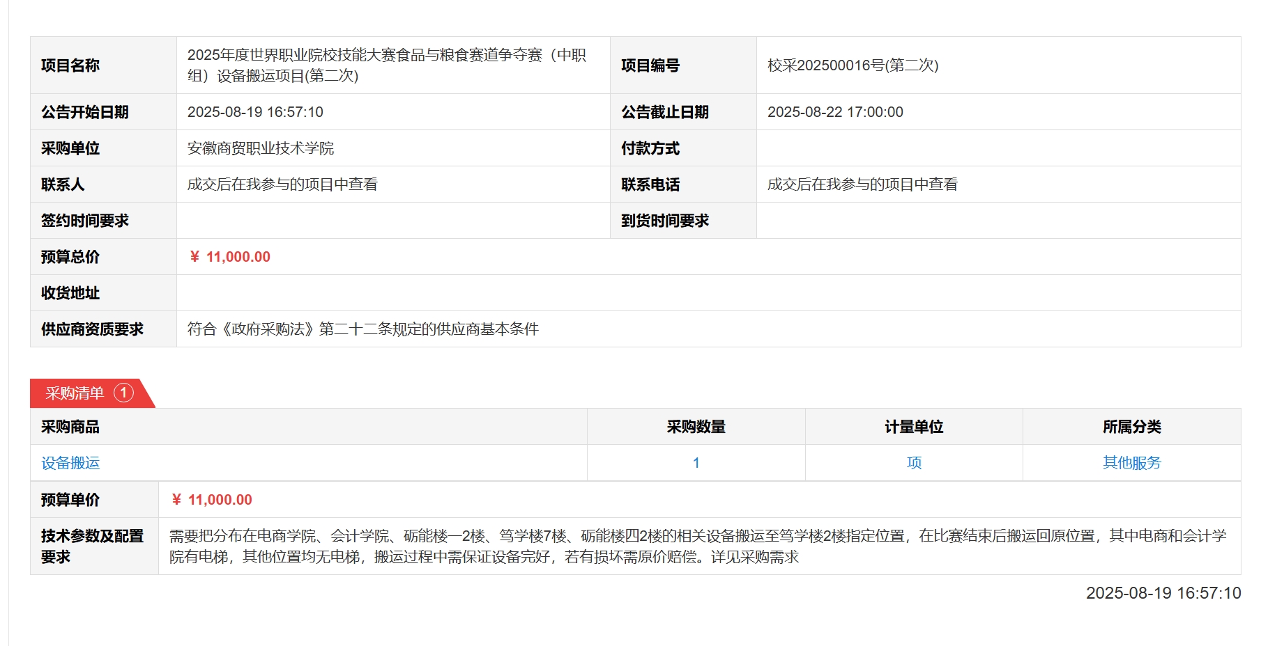 2025年度世界职业院校技能大赛食品与粮食赛道争夺赛(中职组)设备搬运项目(第二次)(校采202500016号(第二次))采购公告