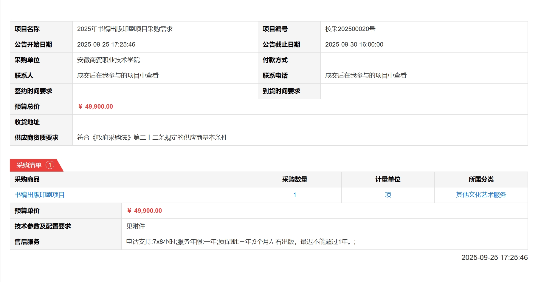 2025年书稿出版印刷项目采购需求(校采202500020号)采购公告