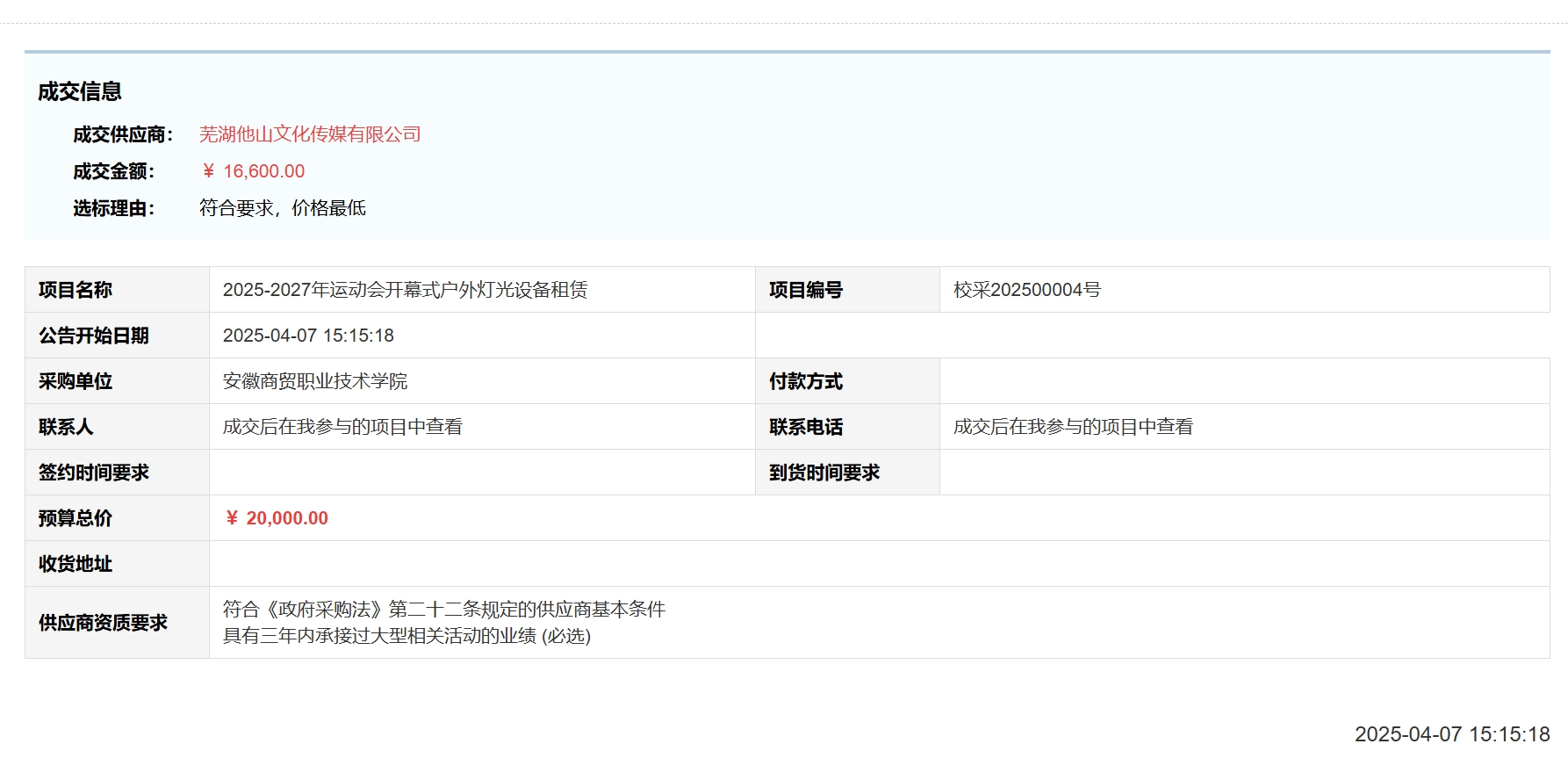2025-2027年运动会开幕式户外灯光设备租赁(校采202500004号)成交结果公告
