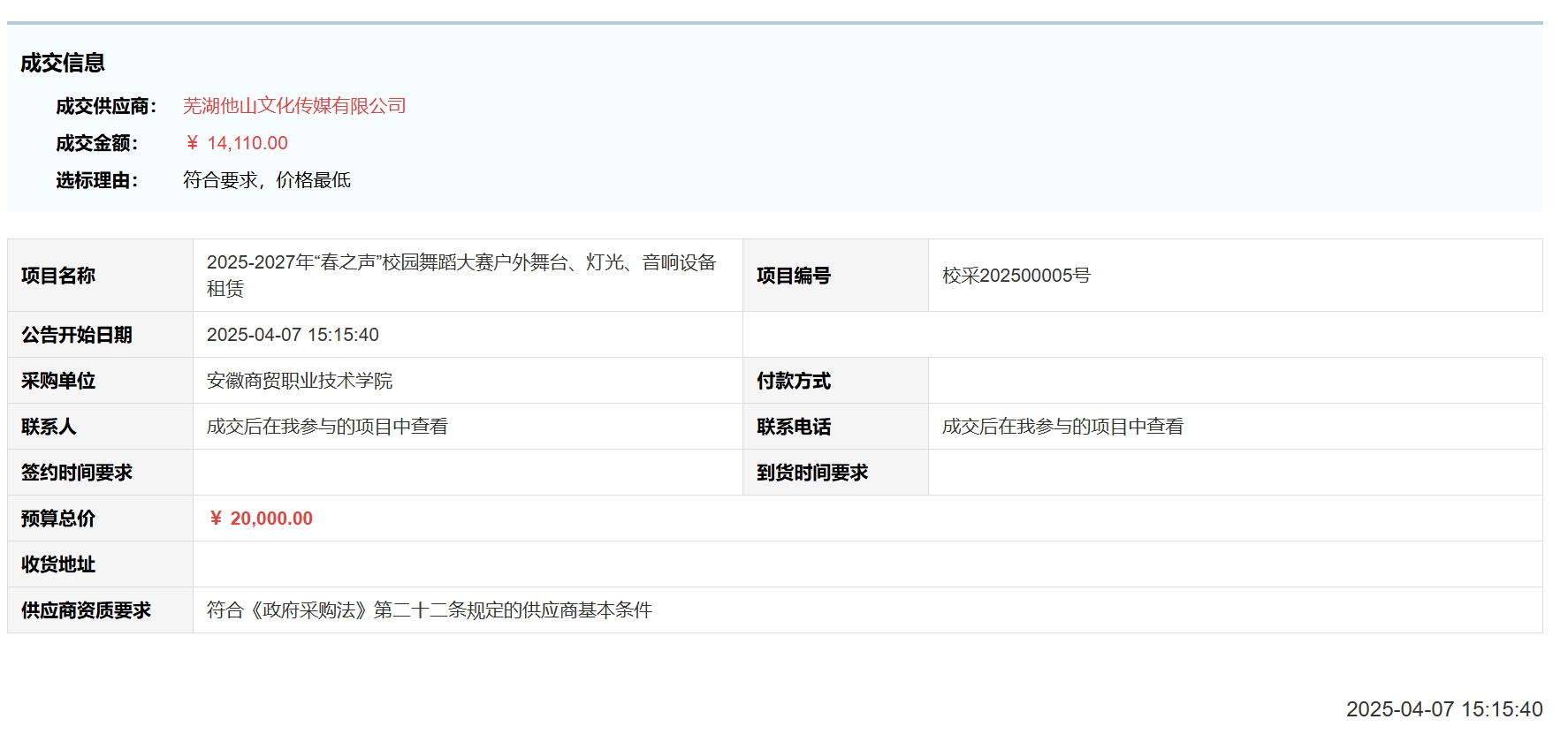 2025-2027年“春之声”校园舞蹈大赛户外舞台、灯光、音响设备租赁(校采202500005号)成交结果公告