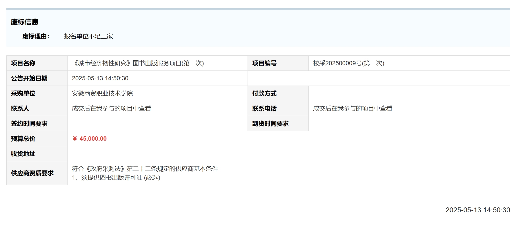 《城市经济韧性研究》图书出版服务项目(第二次)(校采202500009号(第二次))废标公告