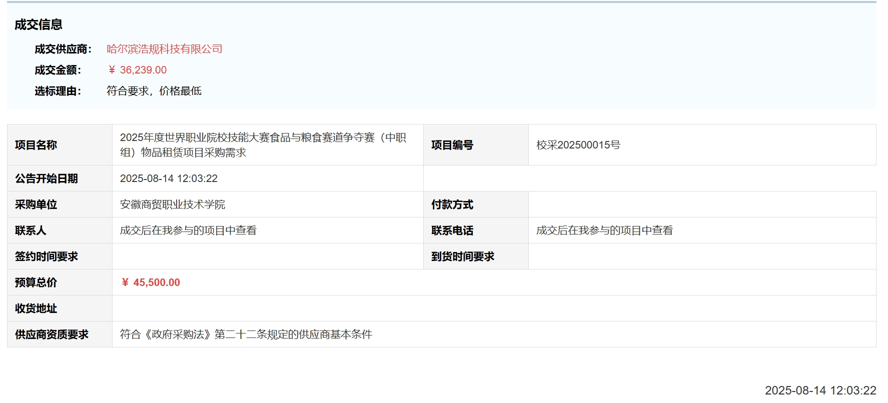 2025年度世界职业院校技能大赛食品与粮食赛道争夺赛(中职组)物品租赁项目采购需求(校采202500015号)成交结果公告