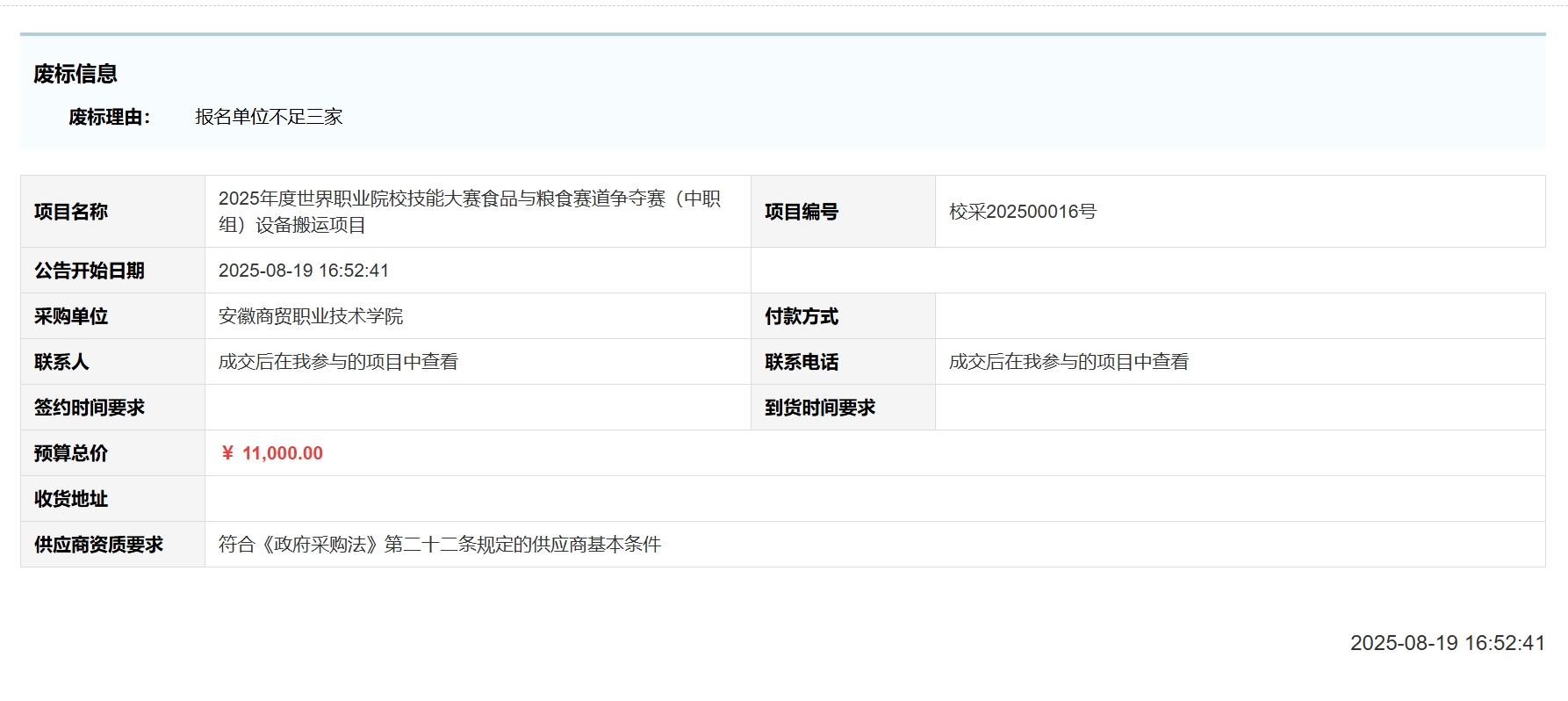 2025年度世界职业院校技能大赛食品与粮食赛道争夺赛(中职组)设备搬运项目(校采202500016号)废标公告