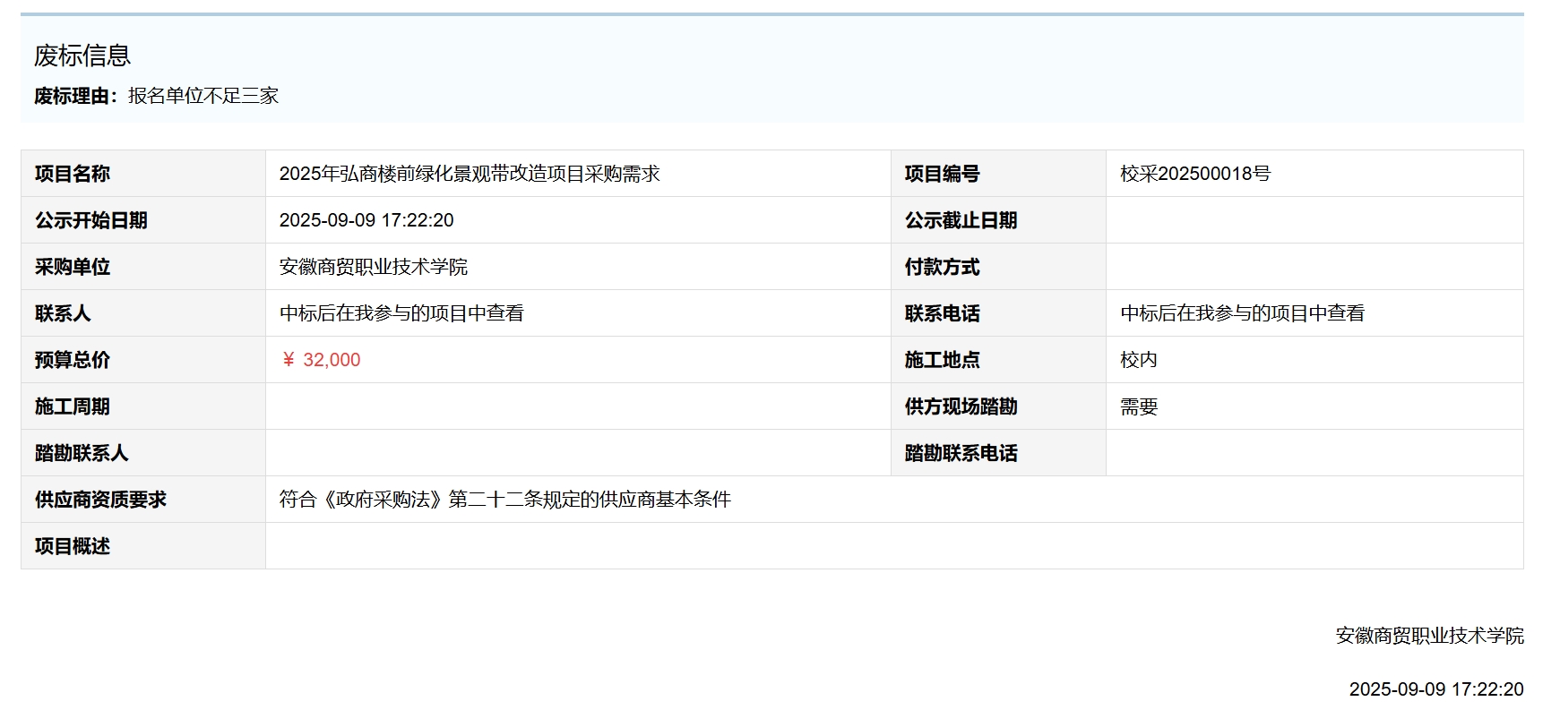 2025年弘商楼前绿化景观带改造项目采购需求(校采202500018号)废标公告