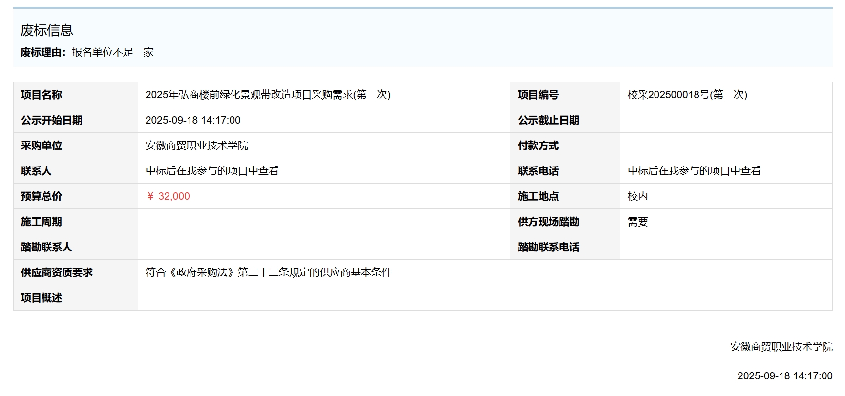 2025年弘商楼前绿化景观带改造项目采购需求(第二次)(校采202500018号(第二次))废标公告