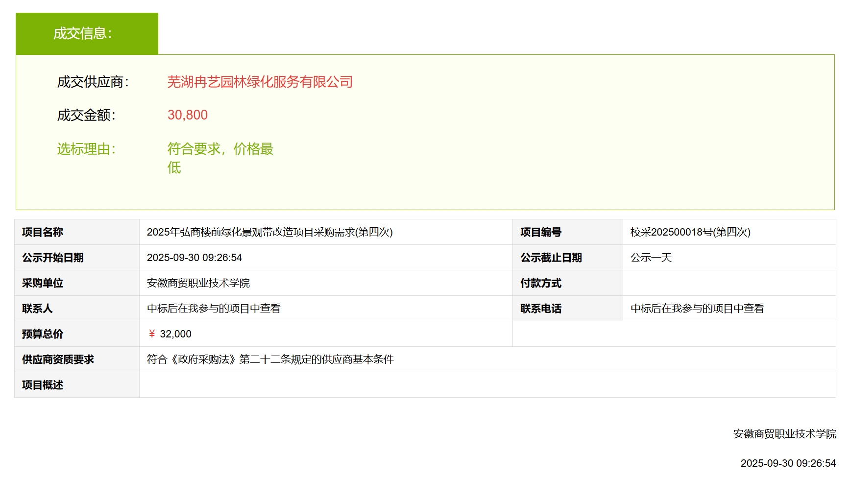 2025年弘商楼前绿化景观带改造项目采购需求(第四次)(校采202500018号(第四次))成交结果公告