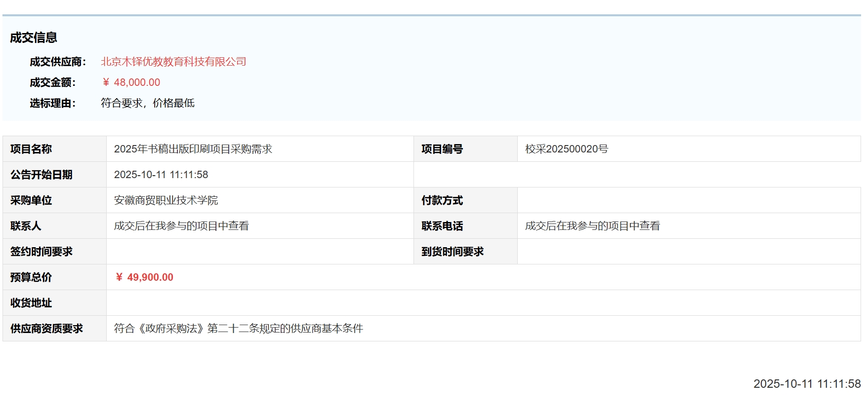 2025年书稿出版印刷项目采购需求(校采202500020号)成交结果公告