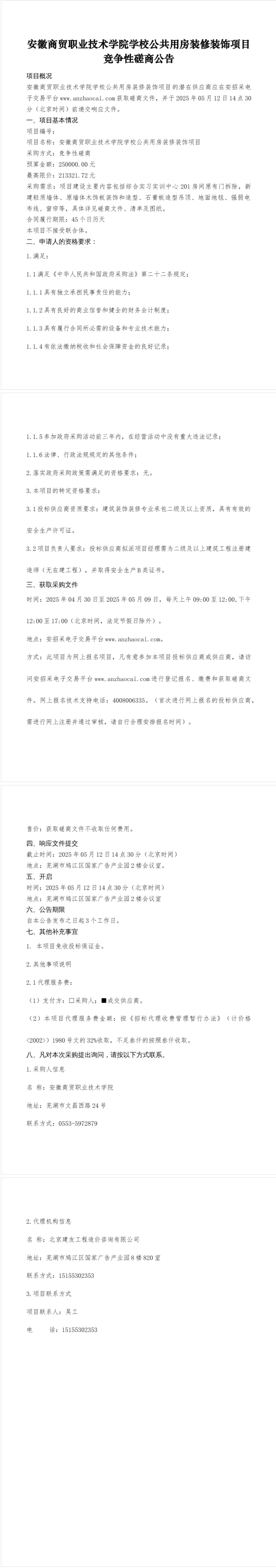 安徽商贸职业技术学院学校公共用房装修装饰项目竞争性磋商公告