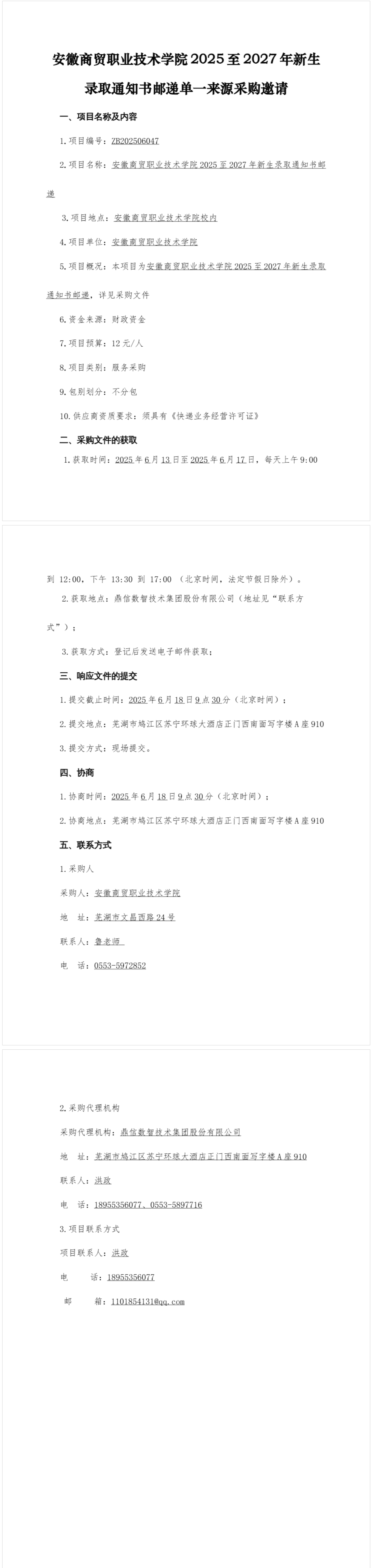 安徽商贸职业技术学院2025至2027年新生录取通知书邮递单一来源采购邀请