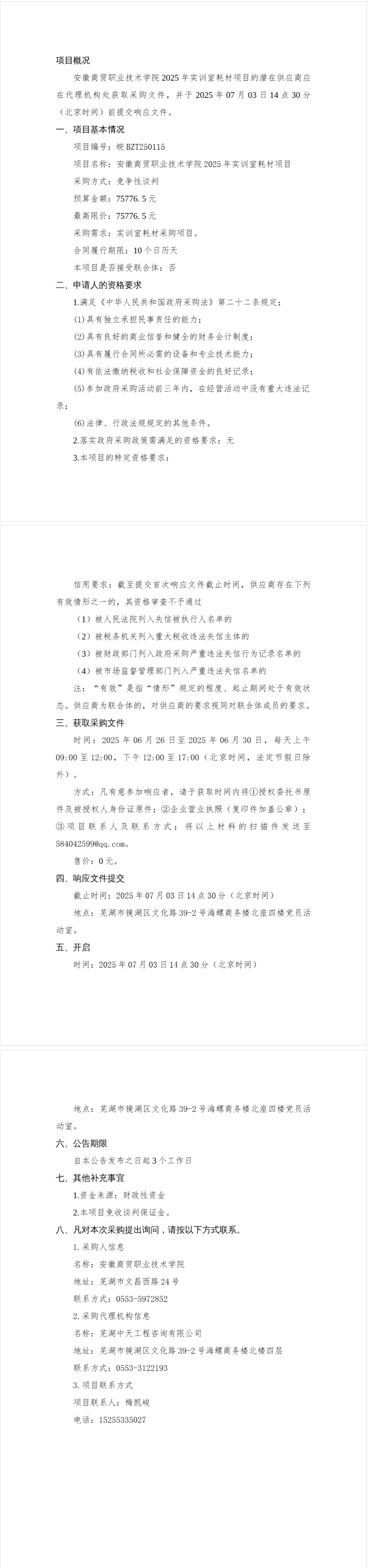 安徽商贸职业技术学院2025年实训室耗材项目竞争性谈判公告