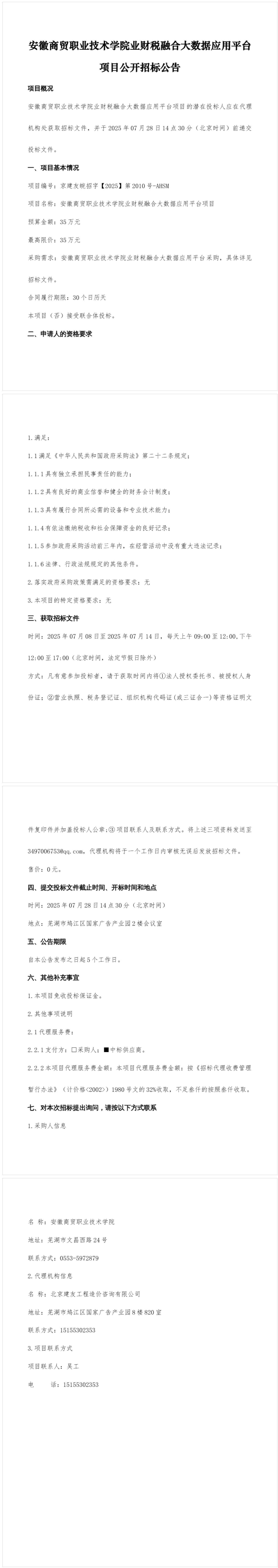 安徽商贸职业技术学院业财税融合大数据应用平台项目公开招标公告