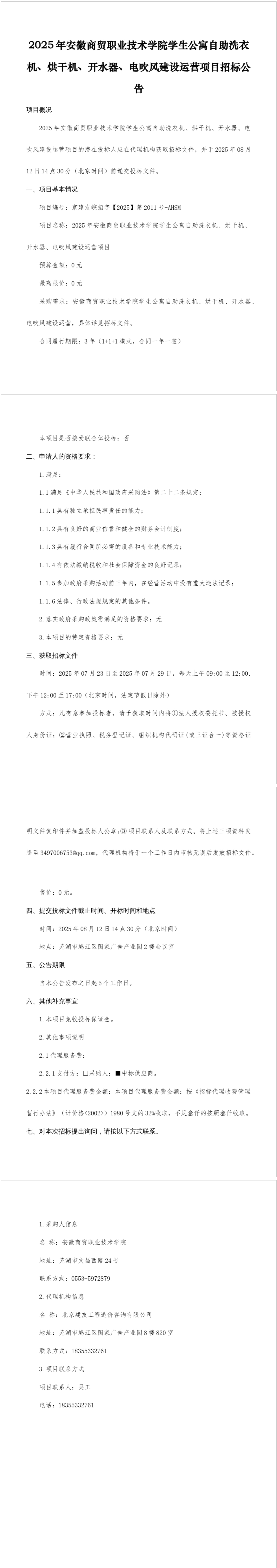 2025年安徽商贸职业技术学院学生公寓自助洗衣机、烘干机、开水器、电吹风建设运营项目招标公告