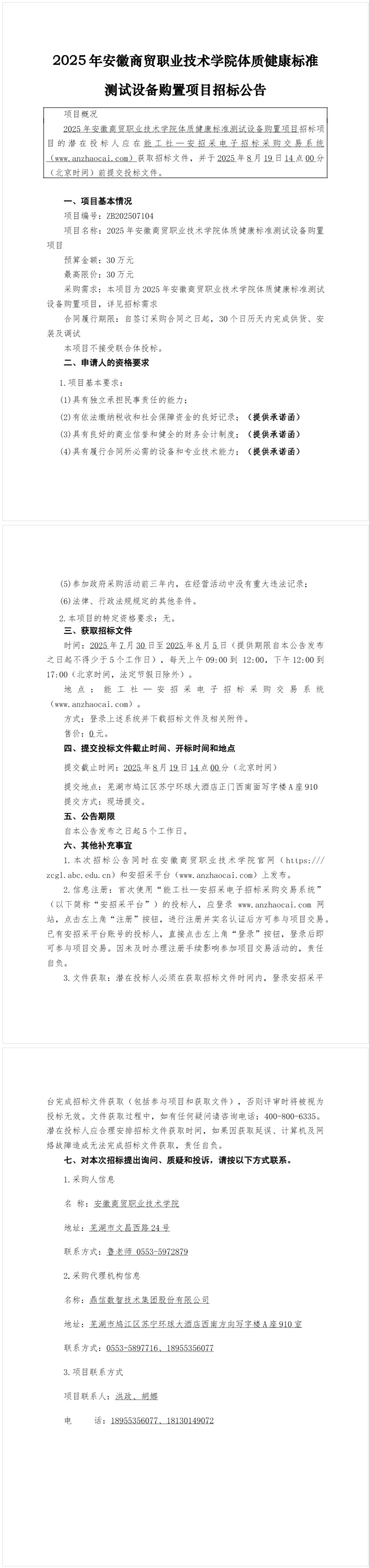 2025年安徽商贸职业技术学院体质健康标准测试设备购置项目招标公告