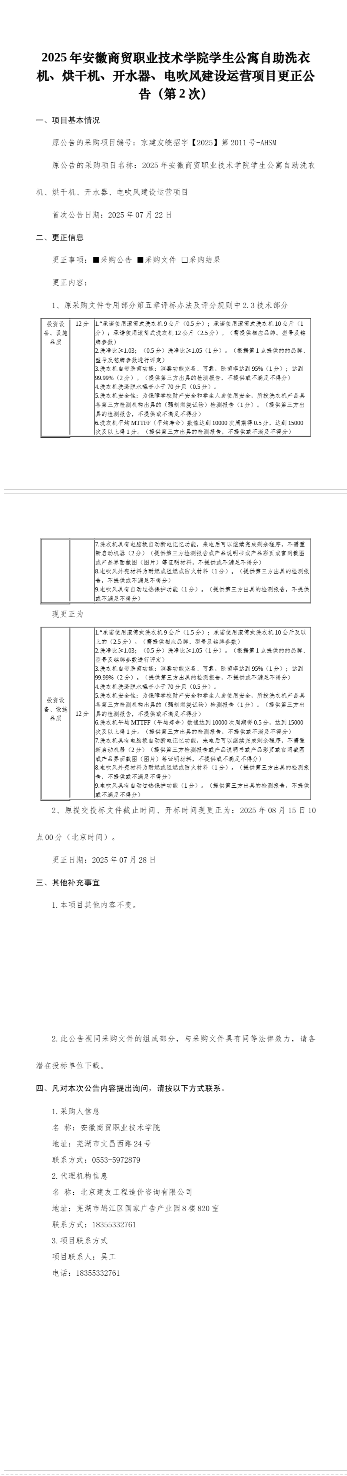 2025年安徽商贸职业技术学院学生公寓自助洗衣机、烘干机、开水器、电吹风建设运营项目更正公告(第2次)